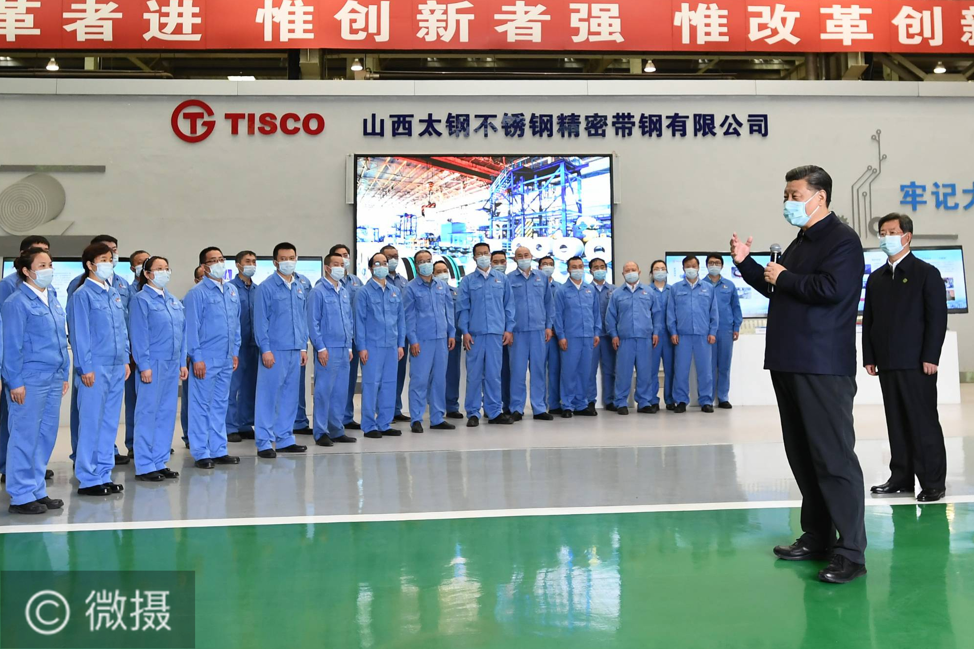 习近平在山西考察。5月11日至12日,中共中央总书记、国家主席、中央军委主席习近平在山西考察。这是5月12日上午,习近平在太钢不锈钢精密带钢有限公司生产车间考察时,同企业职工亲切交流。新华社记者 谢环驰 摄