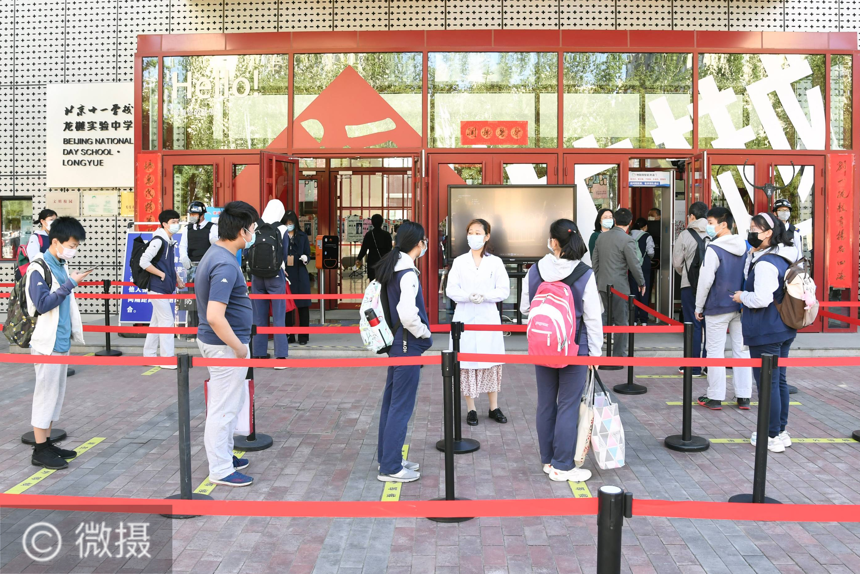 新华社照片,北京,2020年5月11日。北京初三年级开学复课。5月11日,在位于北京市海淀区的北京市十一学校龙樾实验中学,初三年级学生排队进入教学楼。当日,北京市初三年级学生开学复课。新华社记者 任超 摄