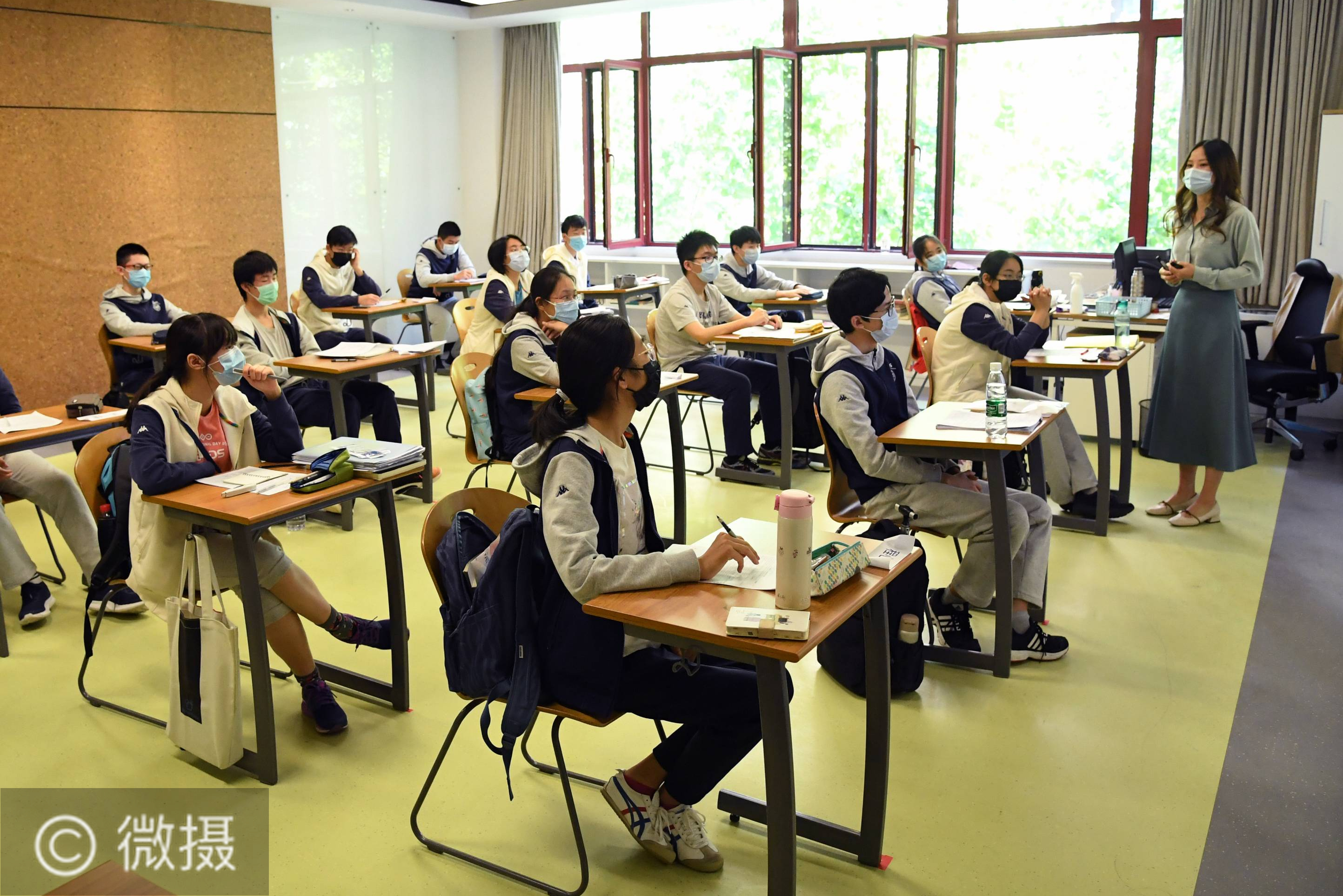 新华社照片,北京,2020年5月11日。北京初三年级开学复课。5月11日,在位于北京市海淀区的北京市十一学校龙樾实验中学,初三年级学生在课堂上。当日,北京市初三年级学生开学复课。 新华社记者 任超 摄