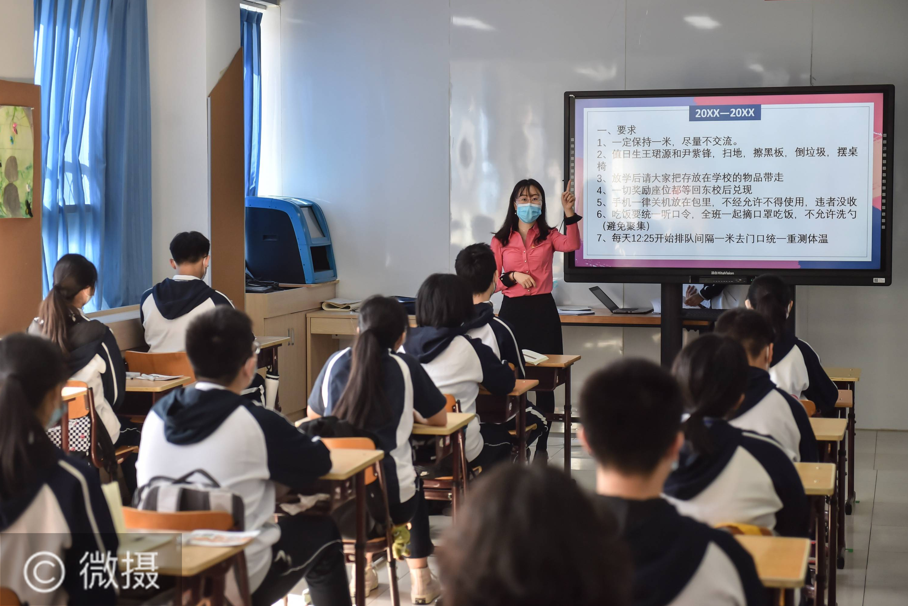 新华社照片,北京,2020年5月11日。北京初三年级开学复课。5月11日,北京市第一六六中学的老师给返校的同学讲解在校时的防疫规定和知识。当日,北京市初三年级学生开学复课。新华社记者 彭子洋 摄
