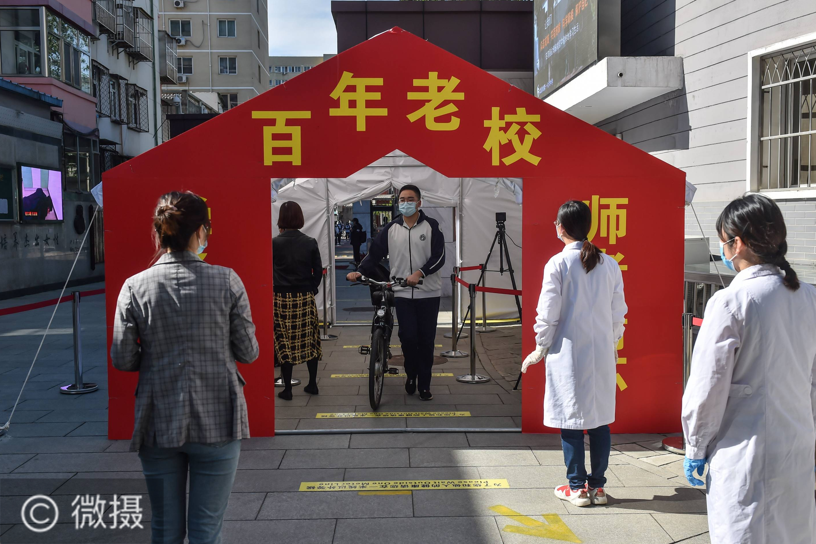 北京初三年级开学复课。5月11日,北京市第一六六中学的学生通过测温棚后进入学校。当日,北京市初三年级学生开学复课。新华社记者 彭子洋 摄 (新华社照片,北京,2020年5月11日)