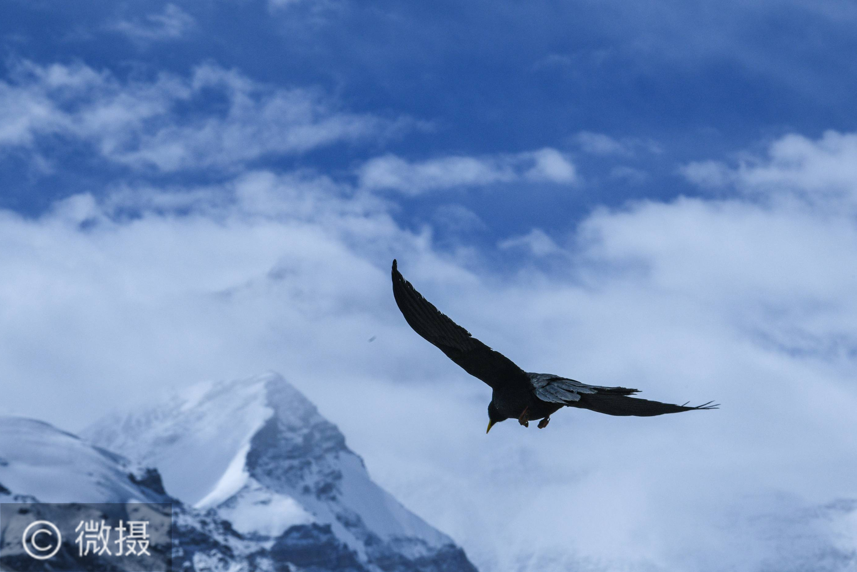 新华社照片,北京,2020年5月10日(镜观中国·新华社国内新闻照片一周精选)(5)雪域精灵在珠峰国家级自然保护区内飞翔的黄嘴山鸦(4月19日摄)。珠穆朗玛峰山区高寒缺氧。然而,这里却栖息着一群雪域精灵。新华社记者 孙非 摄