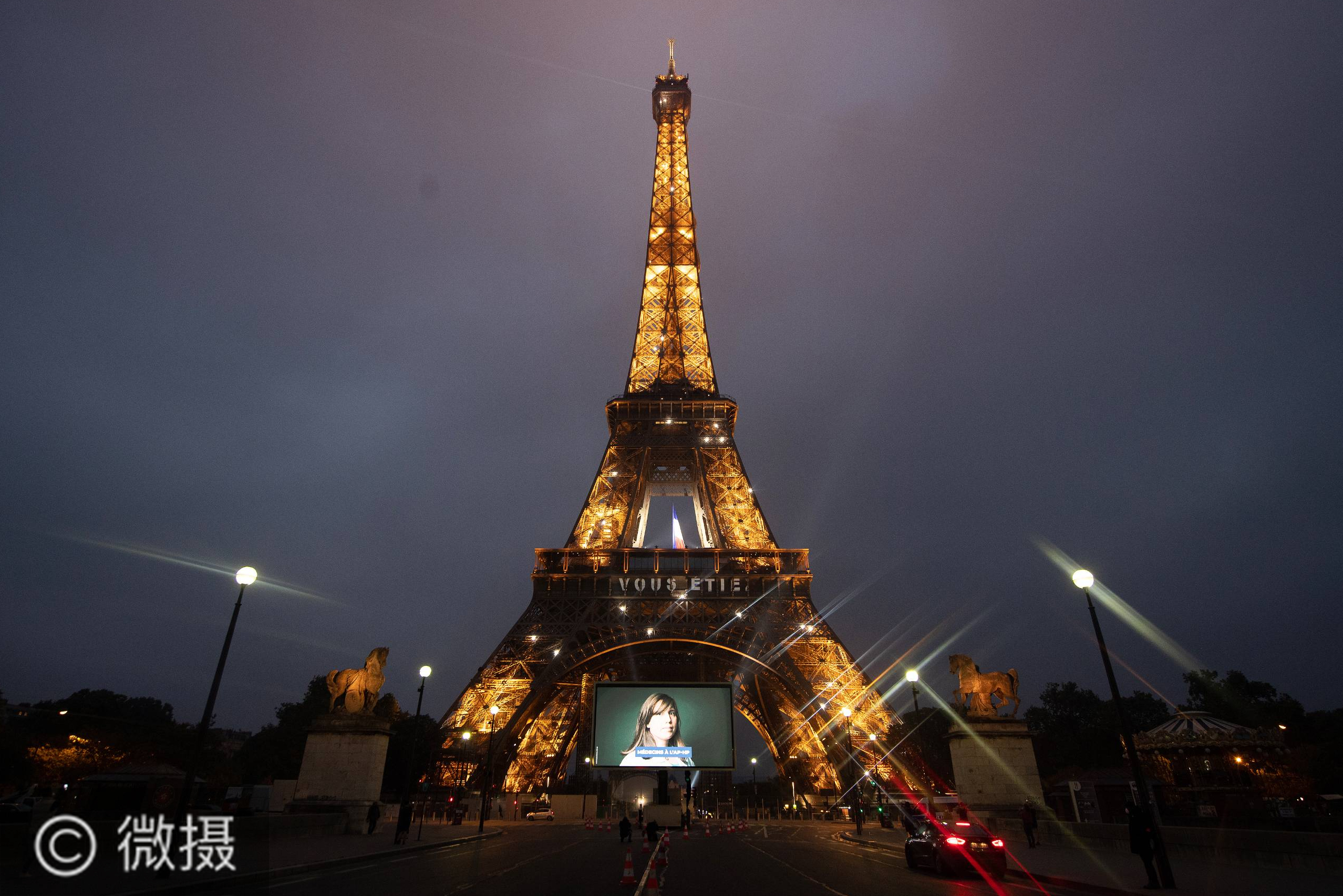 5月10日晚,法国巴黎埃菲尔铁塔前竖起大屏幕,滚动播放在疫情期间坚守岗位的医护人员、消防员、快递员、清洁工等劳动者的照片,并配上“巴黎感谢那些让我们怎么谢都谢不够的人们”等字幕,向他们致谢并致敬。法国将于5月11日起逐步放松应对疫情的限制性措施。新华社发(杰克·陈摄)