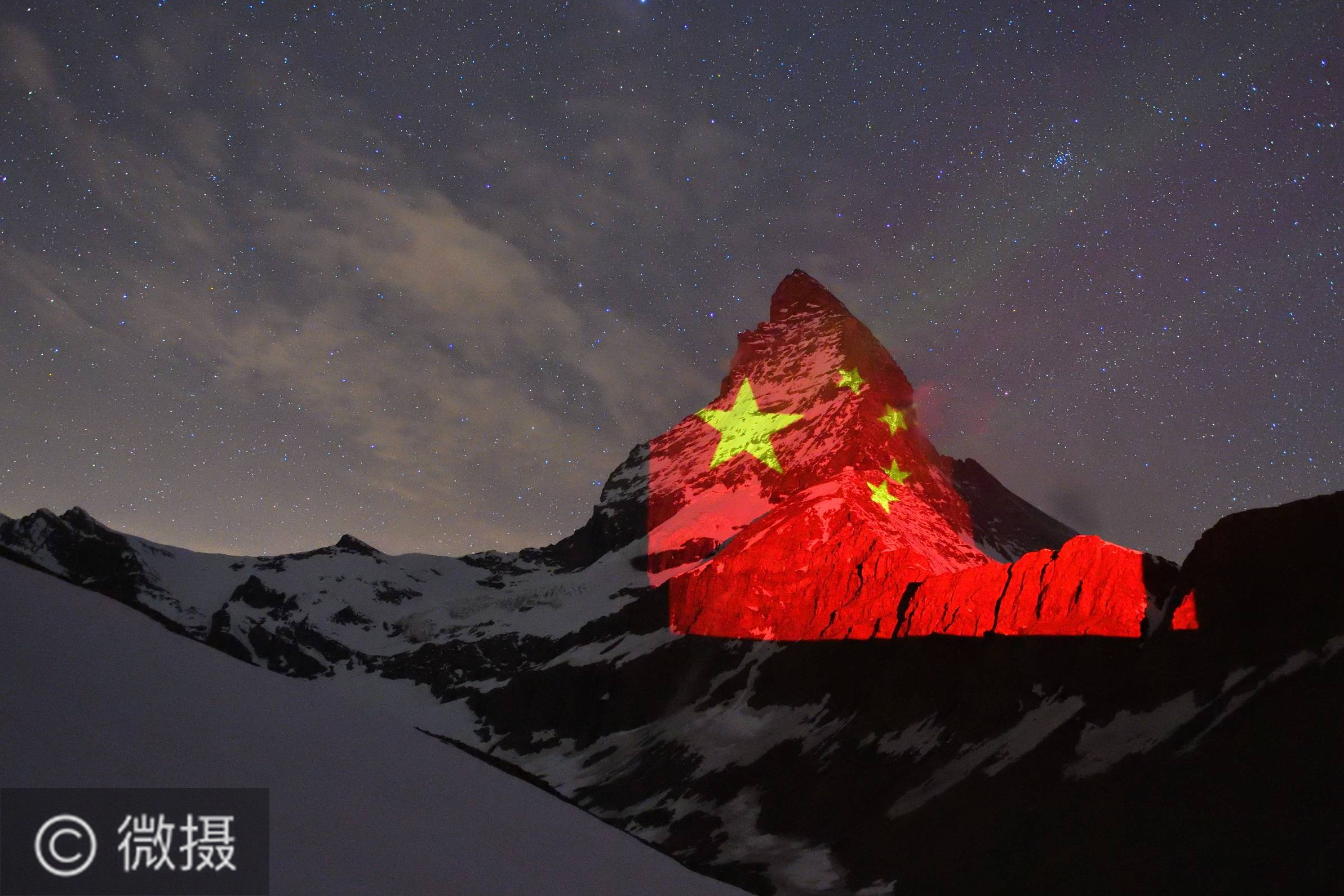 【新华社照片,北京,2020年5月10日】钟华论:在民族复兴的历史丰碑上——2020中国抗疫记。4月19日,瑞士采尔马特市旅游局用灯光将一面五星红旗投射到附近阿尔卑斯山脉的马特洪峰。新华社发(瑞士采尔马特市旅游局供图)