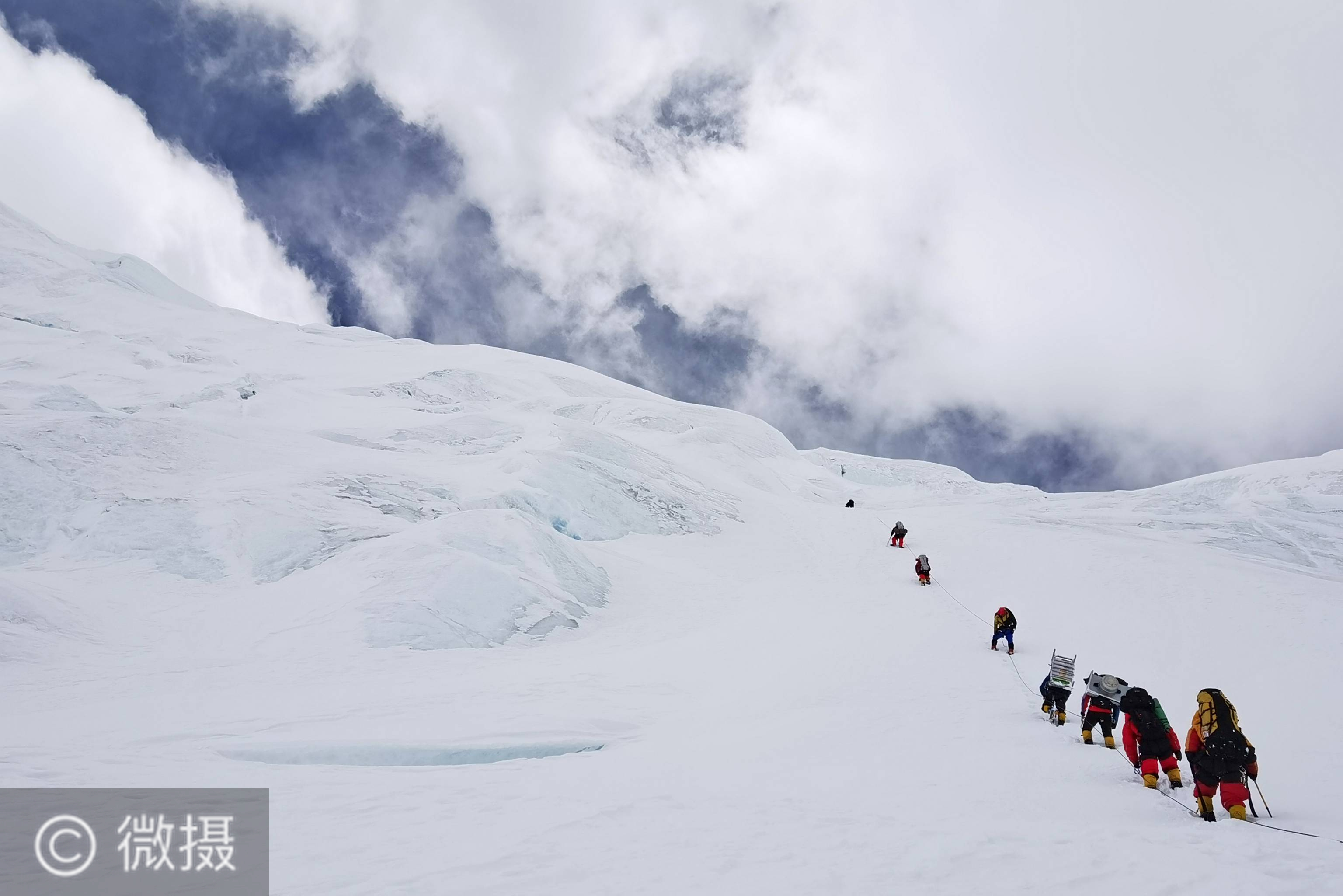 微摄图播|2020珠峰高程测量(3):珠峰好天气 有望打通顶峰之路。5月8日,登山向导向海拔7028米的营地运输高山氧气、燃料等物资。据西藏圣山公司的登山向导介绍,保护绳有望在未来两天里铺设到顶峰,通往顶峰的“路”有望修通,这也是登顶最重要的前提条件之一。新华社特约记者 拉巴 摄