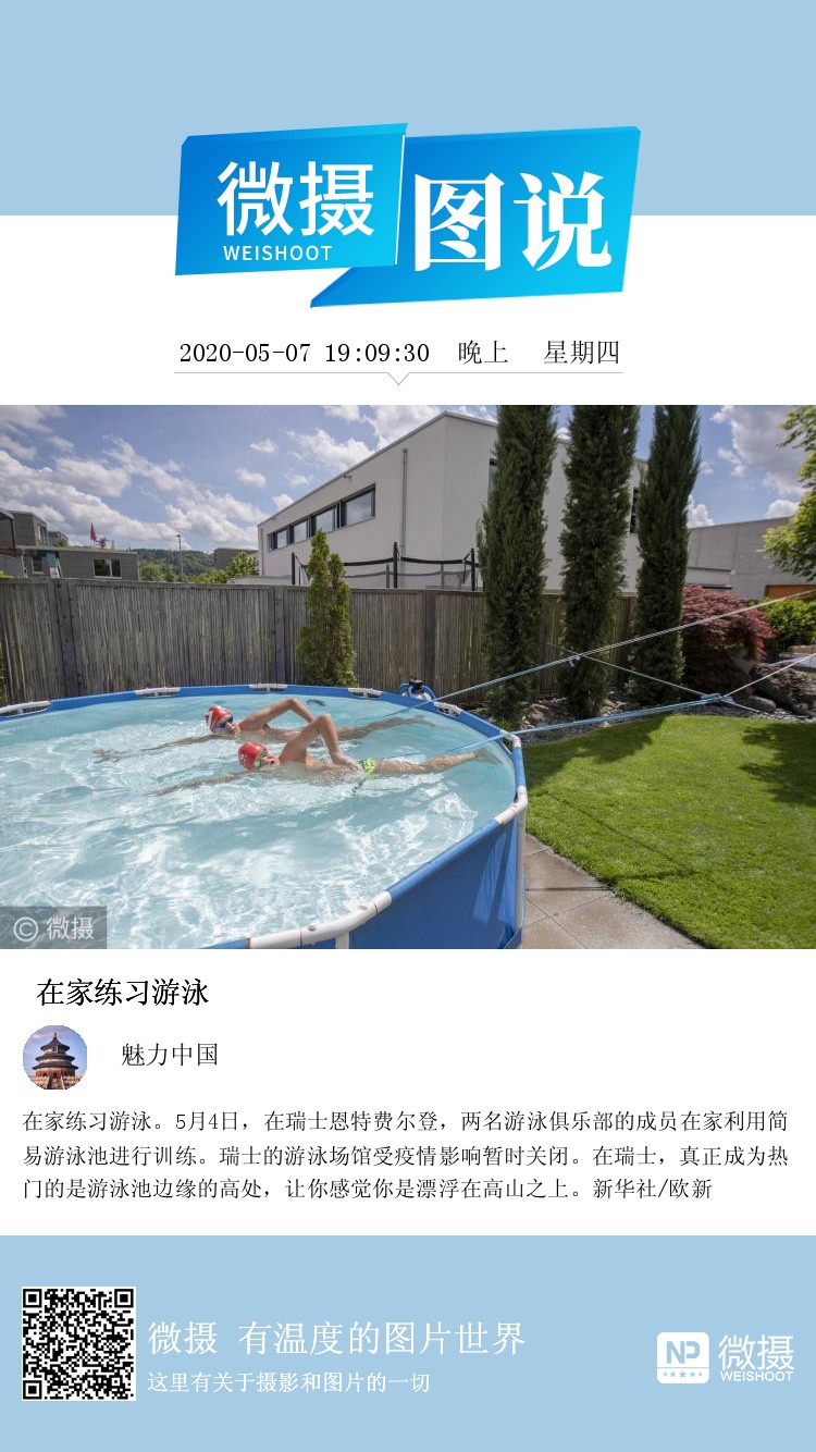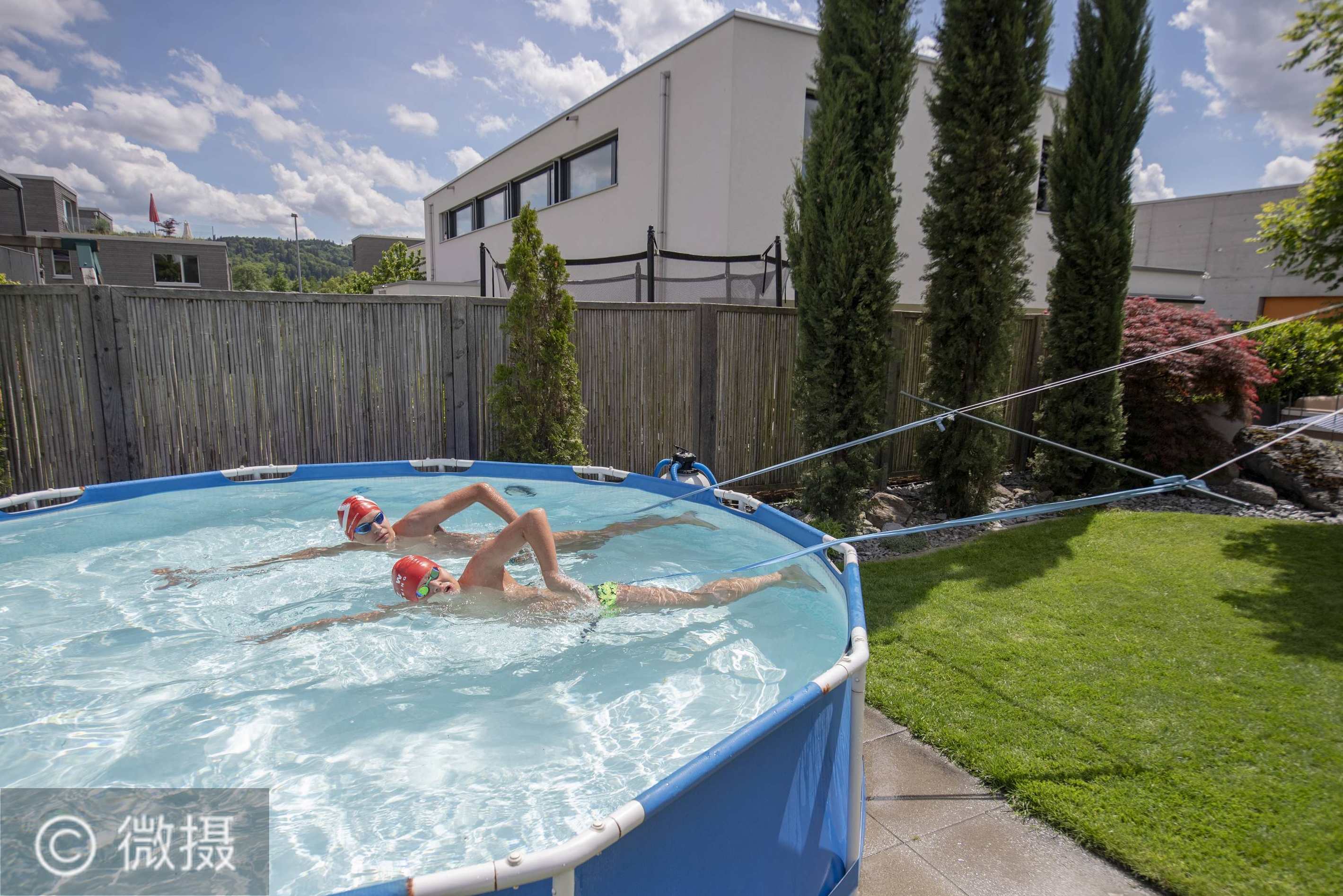 在家练习游泳。5月4日,在瑞士恩特费尔登,两名游泳俱乐部的成员在家利用简易游泳池进行训练。瑞士的游泳场馆受疫情影响暂时关闭。在瑞士,真正成为热门的是游泳池边缘的高处,让你感觉你是漂浮在高山之上。新华社/欧新