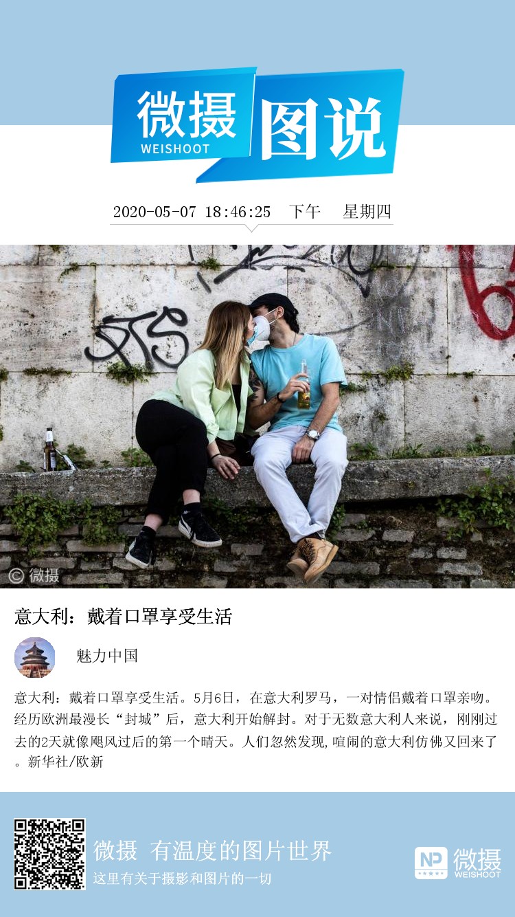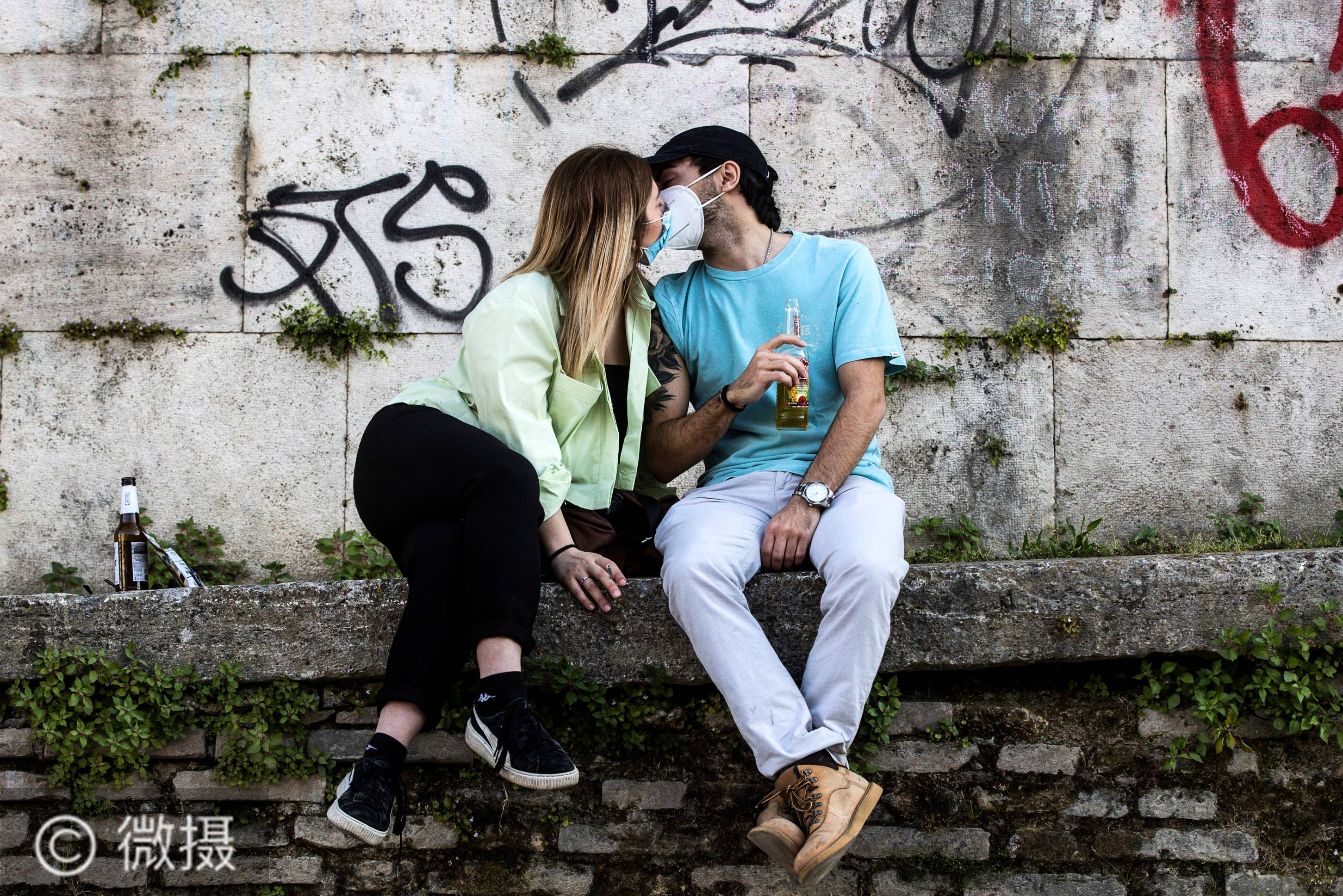 意大利:戴着口罩享受生活。5月6日,在意大利罗马,一对情侣戴着口罩亲吻。经历欧洲最漫长“封城”后,意大利开始解封。对于无数意大利人来说,刚刚过去的2天就像飓风过后的第一个晴天。人们忽然发现,喧闹的意大利仿佛又回来了。新华社/欧新