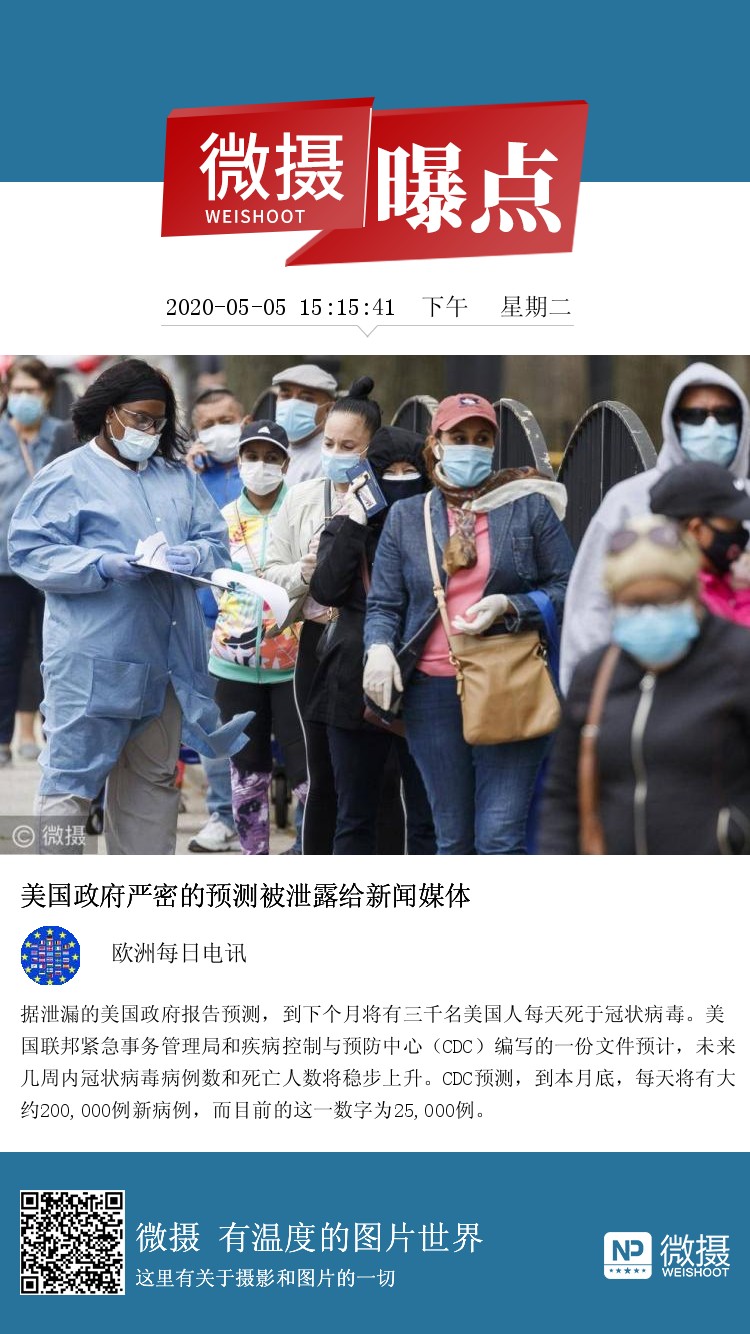 据泄漏的美国政府报告预测,到下个月将有三千名美国人每天死于冠状病毒。美国联邦紧急事务管理局和疾病控制与预防中心(CDC)编写的一份文件预计,未来几周内冠状病毒病例数和死亡人数将稳步上升。CDC预测,到本月底,每天将有大约200,000例新病例,而目前的这一数字为25,000例。