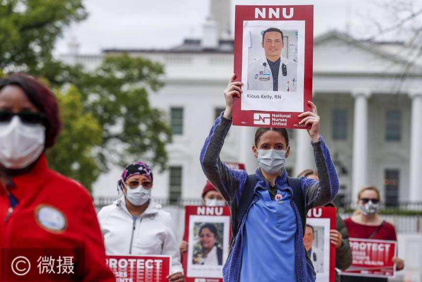 抗议者举着标有50名已死亡的医护人员名字的标语牌。昨天,美国护士大声朗读了他们说死于冠状病毒的50名医护人员的名字,在白宫外面抗议防护设备短缺的问题。一些州长抱怨说,美国的自由市场医疗保健模式使他们陷入了相互之间的国际招标战,有时甚至还针对国家的联邦紧急事务管理局。