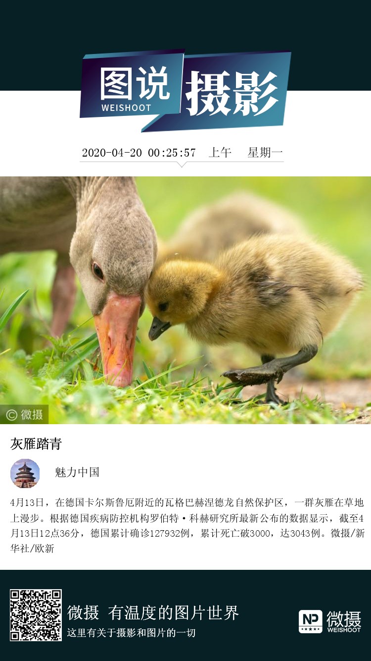4月13日,在德国卡尔斯鲁厄附近的瓦格巴赫涅德龙自然保护区,一群灰雁在草地上漫步。根据德国疾病防控机构罗伯特·科赫研究所最新公布的数据显示,截至4月13日12点36分,德国累计确诊127932例,累计死亡破3000,达3043例。微摄/新华社/欧新