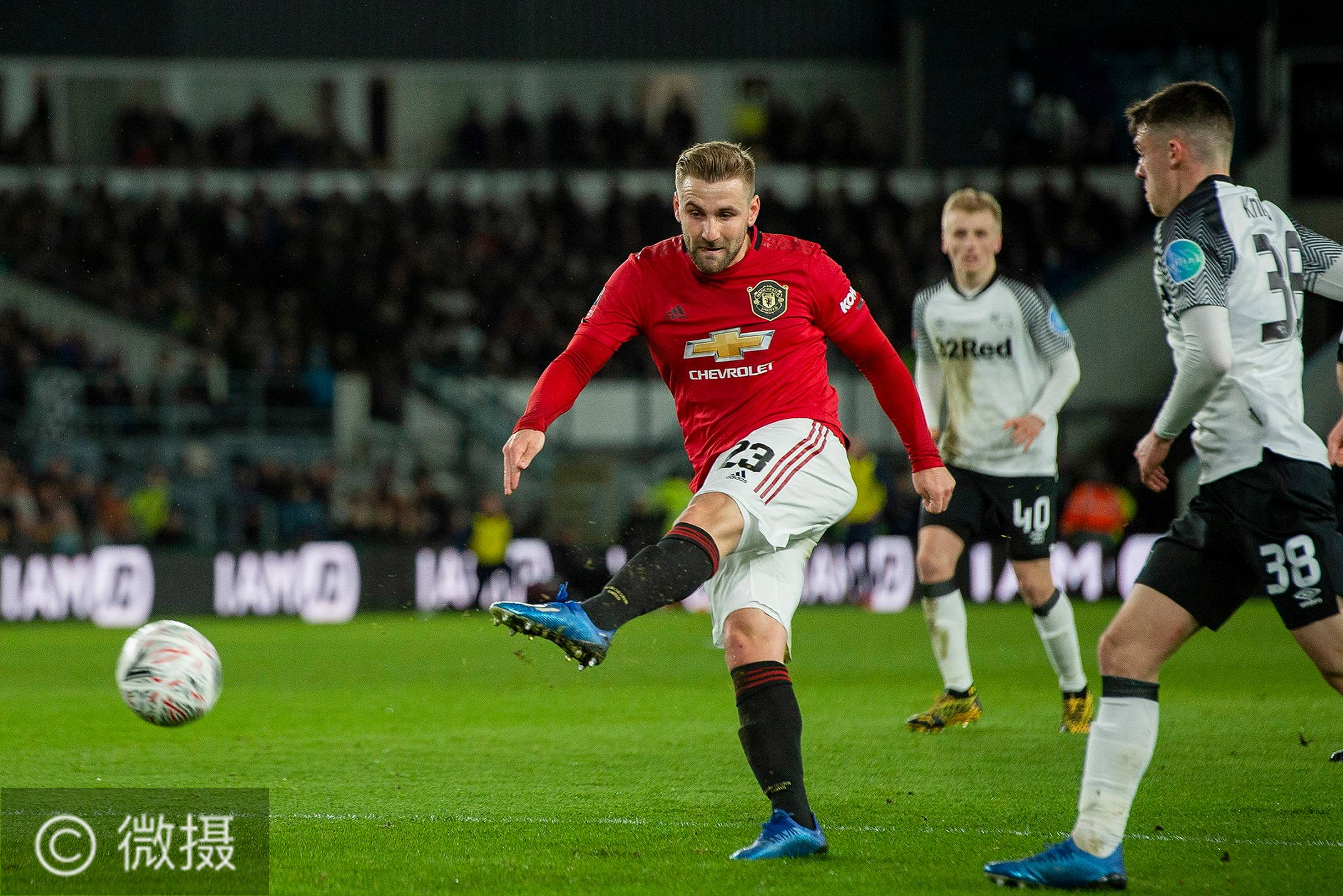 英格兰足总杯:曼联晋级八强。3月5日,曼彻斯特联队球员卢克·肖(左)攻入球队首球。当日,在英国德比进行的2019-2020赛季英格兰足总杯八分之一决赛中,曼彻斯特联队客场以3比0战胜德比郡队,晋级八强。微摄/新华社/欧新