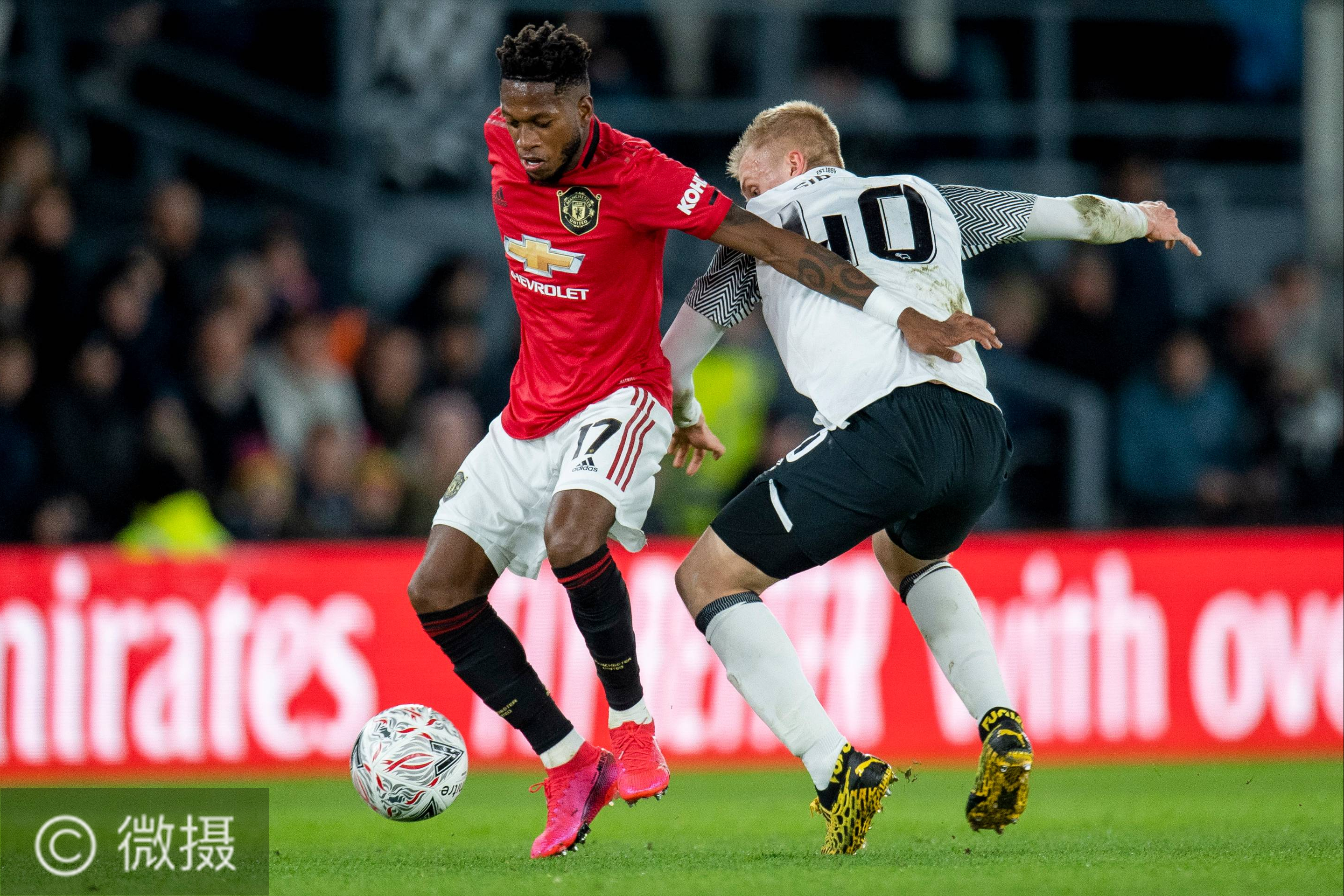 英格兰足总杯:曼联晋级八强。3月5日,曼彻斯特联队球员弗雷德(左)与德比郡队球员西布利拼抢。当日,在英国德比进行的2019-2020赛季英格兰足总杯八分之一决赛中,曼彻斯特联队客场以3比0战胜德比郡队,晋级八强。微摄/新华社/欧新