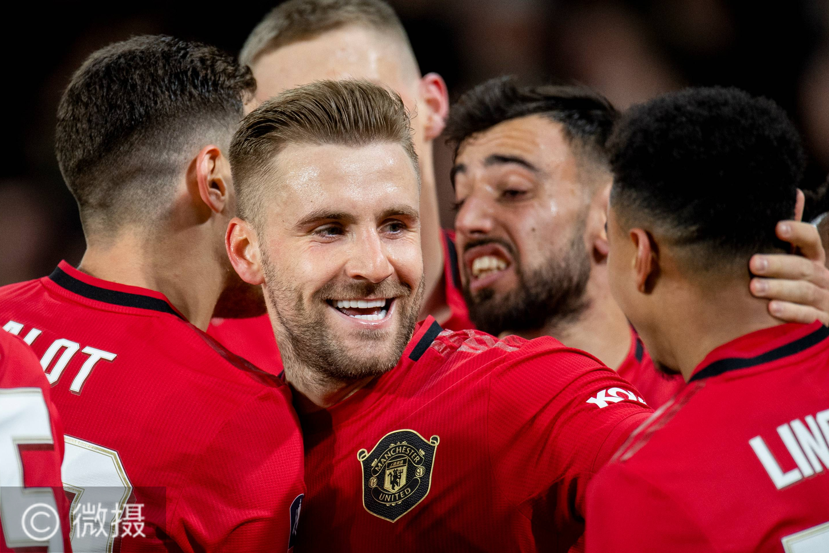英格兰足总杯:曼联晋级八强。 3月5日,曼彻斯特联队球员卢克·肖(中)庆祝攻入球队首球。当日,在英国德比进行的2019-2020赛季英格兰足总杯八分之一决赛中,曼彻斯特联队客场以3比0战胜德比郡队,晋级八强。微摄/新华社/欧新