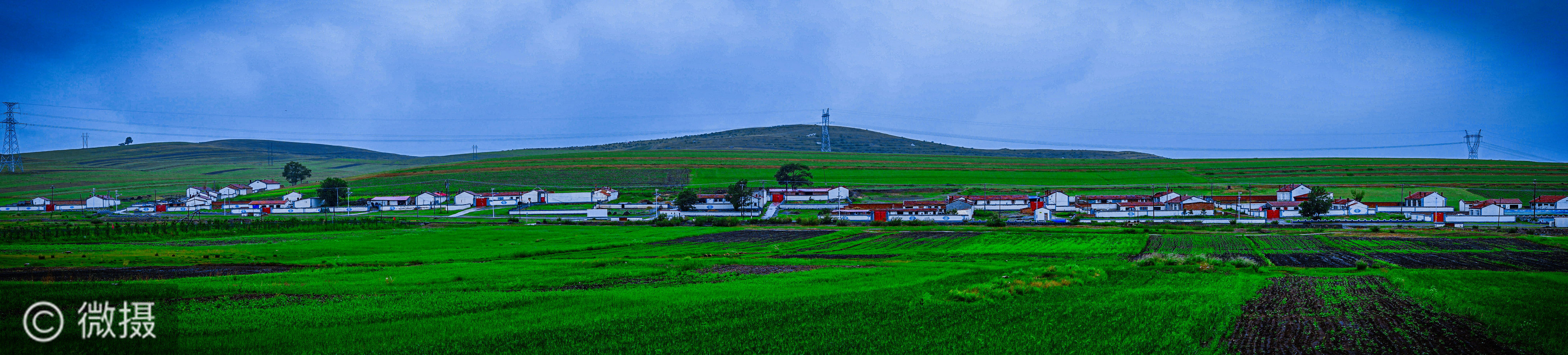 画卷-79(中国、内蒙古、2018) 那天,内蒙古的天空飘着细雨,车窗外的景色有些飘忽,突然,农地那边一排农舍映入眼帘,色彩夺目,我们顾不得小雨跳下车拍下这幅美丽的全景图画面。 Picture-79 (China, Inner Mongolia, 2018) On that da