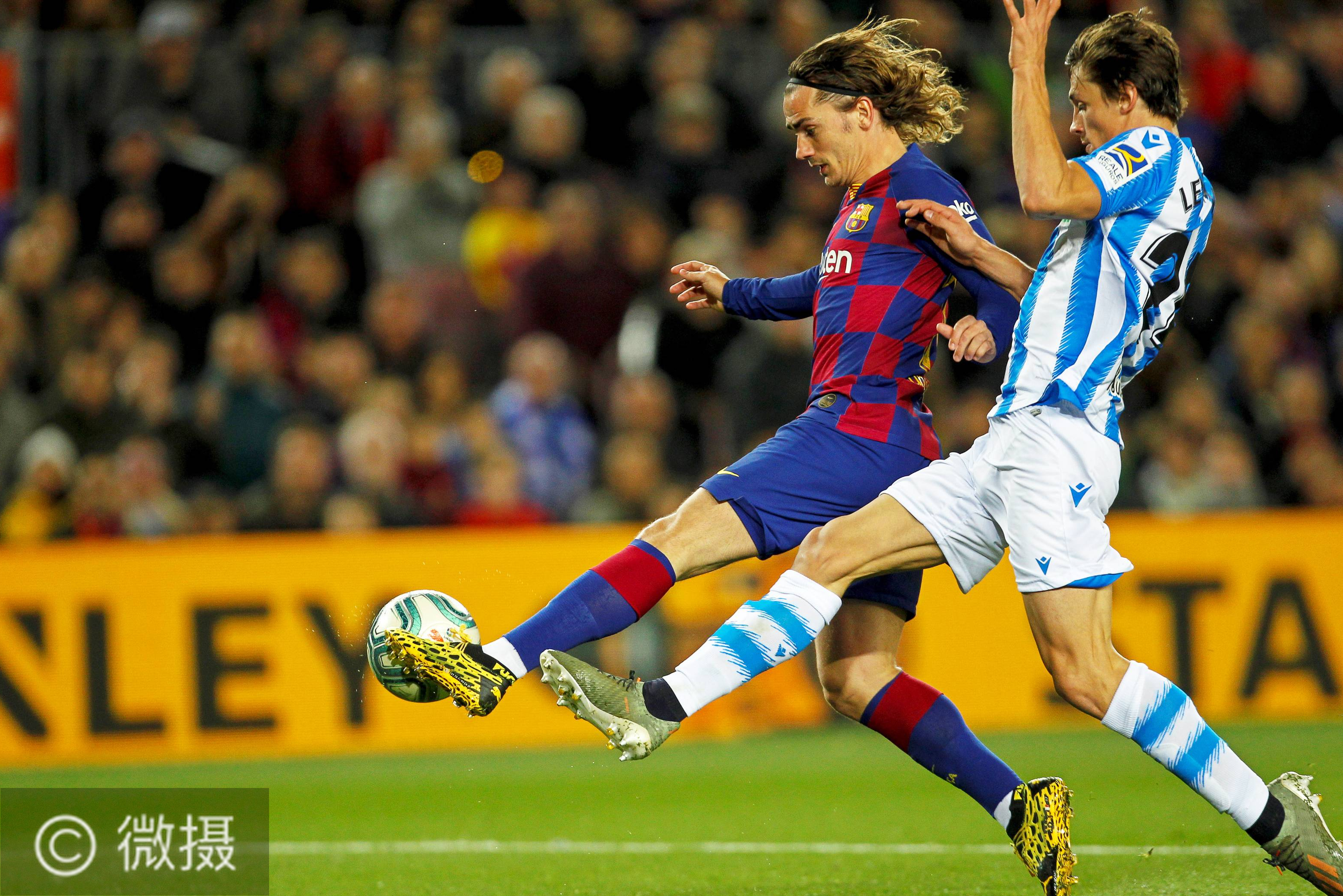 足球——西甲联赛:巴萨胜皇家社会。3月7日,巴塞罗那队球员格列兹曼(左)与皇家社会队球员诺曼德拼抢。当日,在西班牙巴塞罗那进行的2019-2020赛季西甲联赛第27轮的比赛中,巴塞罗那队主场以1比0战胜皇家社会队。新华社/欧新