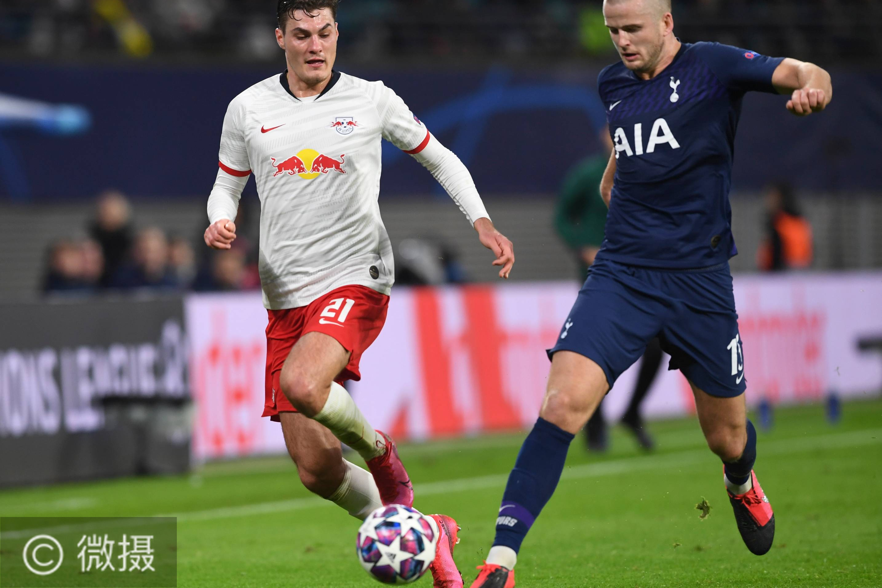 2020年3月10日,莱比锡队球员希克(左)与托特纳姆热刺队球员戴尔拼抢。当日,在德国莱比锡进行的2019-2020赛季欧冠联赛八分之一决赛次回合比赛中,德甲莱比锡队主场以3比0战胜英超托特纳姆热刺队,以4比0的总比分晋级八强。新华社/欧新