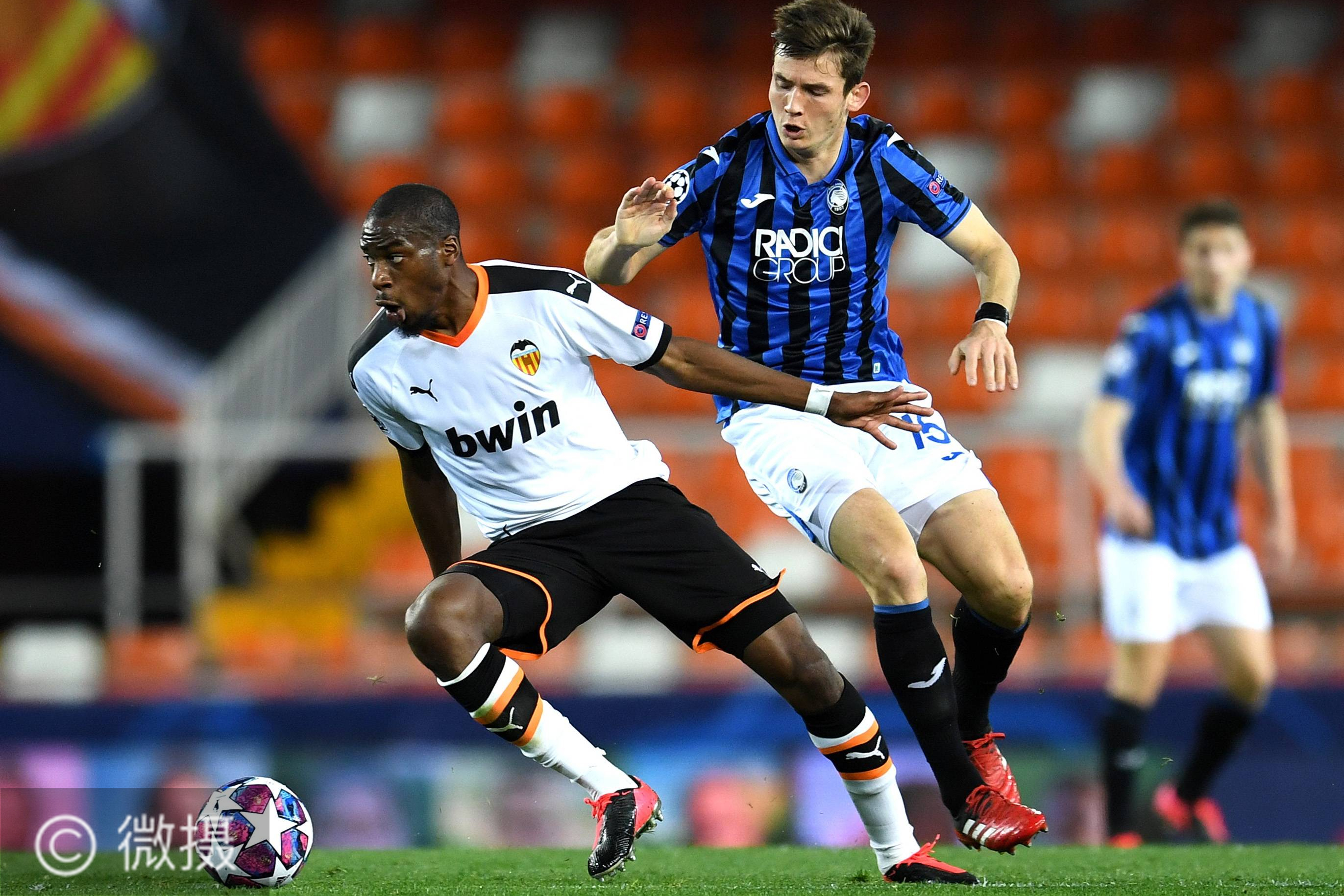 2020年3月10日,亚特兰大队球员德鲁恩(右)与巴伦西亚队球员孔多比亚拼抢。当日,在西班牙巴伦西亚进行的2019-2020赛季欧冠联赛八分之一决赛次回合比赛中,意甲亚特兰大队客场以4比3战胜西甲巴伦西亚队,以8比4的总比分晋级八强。新华社/欧新