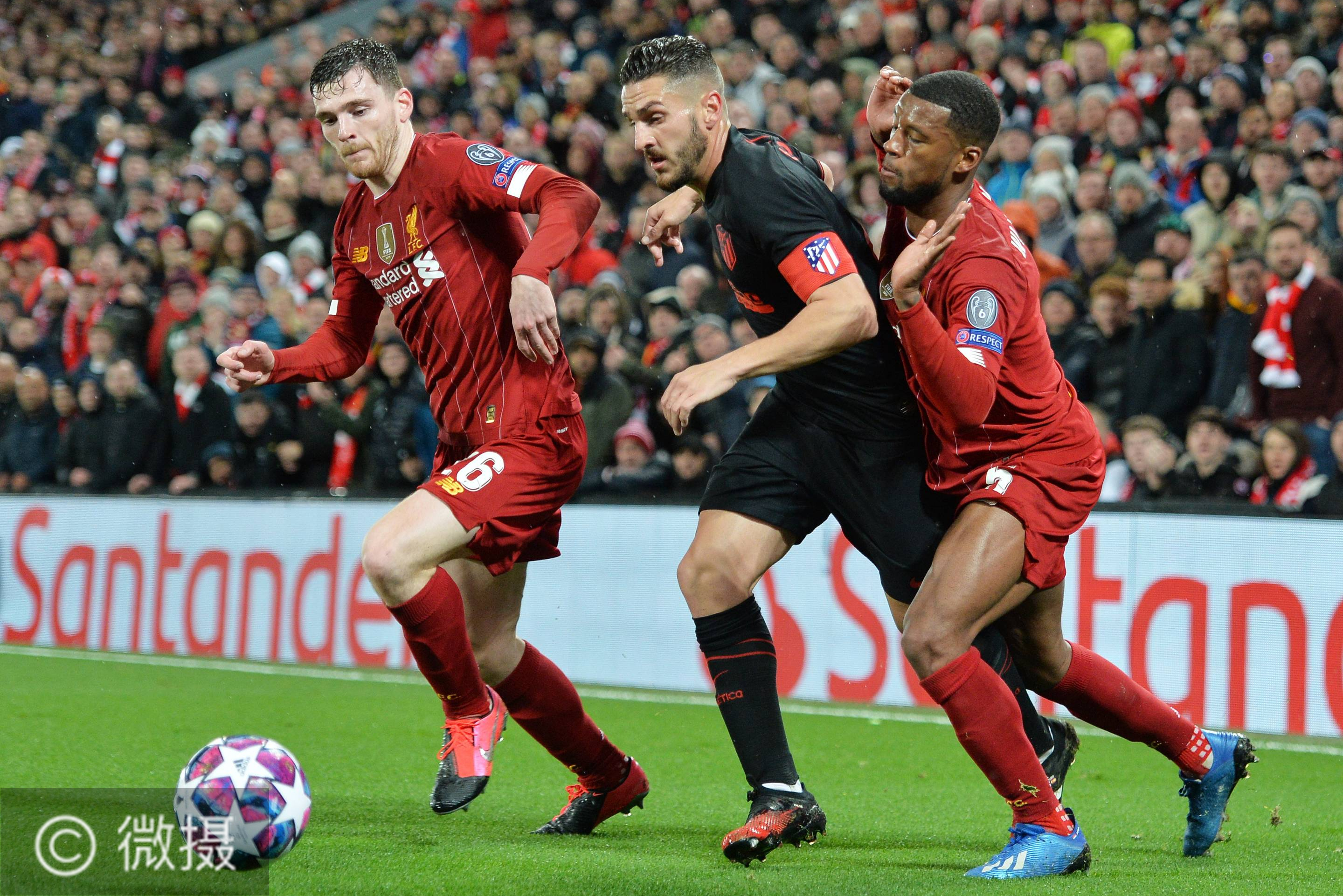 2020年3月11日,马德里竞技队球员科克(中)与利物浦队球员罗伯逊(左)、维纳尔杜姆拼抢。当日,在英国利物浦进行的2019-2020赛季欧冠联赛八分之一决赛次回合比赛中,马德里竞技队客场经过加时赛以3比2战胜利物浦队,从而以4比2的总比分晋级八强。新华社/欧新