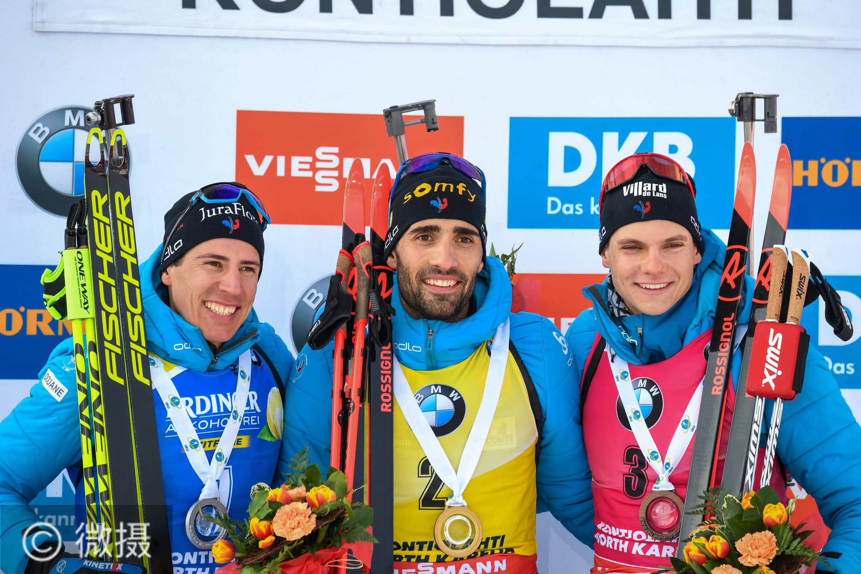 3月14日,在芬兰孔蒂奥拉赫蒂,法国选手富尔卡德(中)在男子12.5公里追逐赛颁奖仪式上。富尔卡德获得本站比赛男子12.5公里追逐赛冠军及本赛季个人赛、冲刺赛总冠军。 国际冬季两项联盟13日宣布,由于新冠肺炎疫情的影响,冬季两项世界杯取消挪威站比赛,提前结束本赛季。新华社/欧新