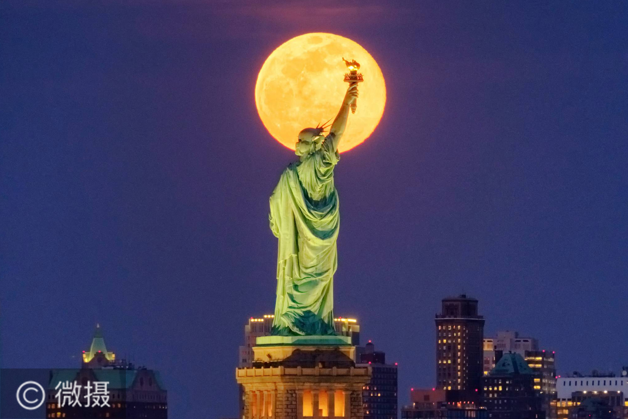 这是2020年3月9日在美国纽约拍摄的“超级月亮”和自由女神像。超级月亮(Supermoon)是一种新月或满月时月亮位于近地点附近的现象。由于月球以椭圆形轨道绕行地球,月球和地球间的距离不断变化,因此满月发生时月亮离地球越近,人们看到的满月也就越大。 新华社/美联