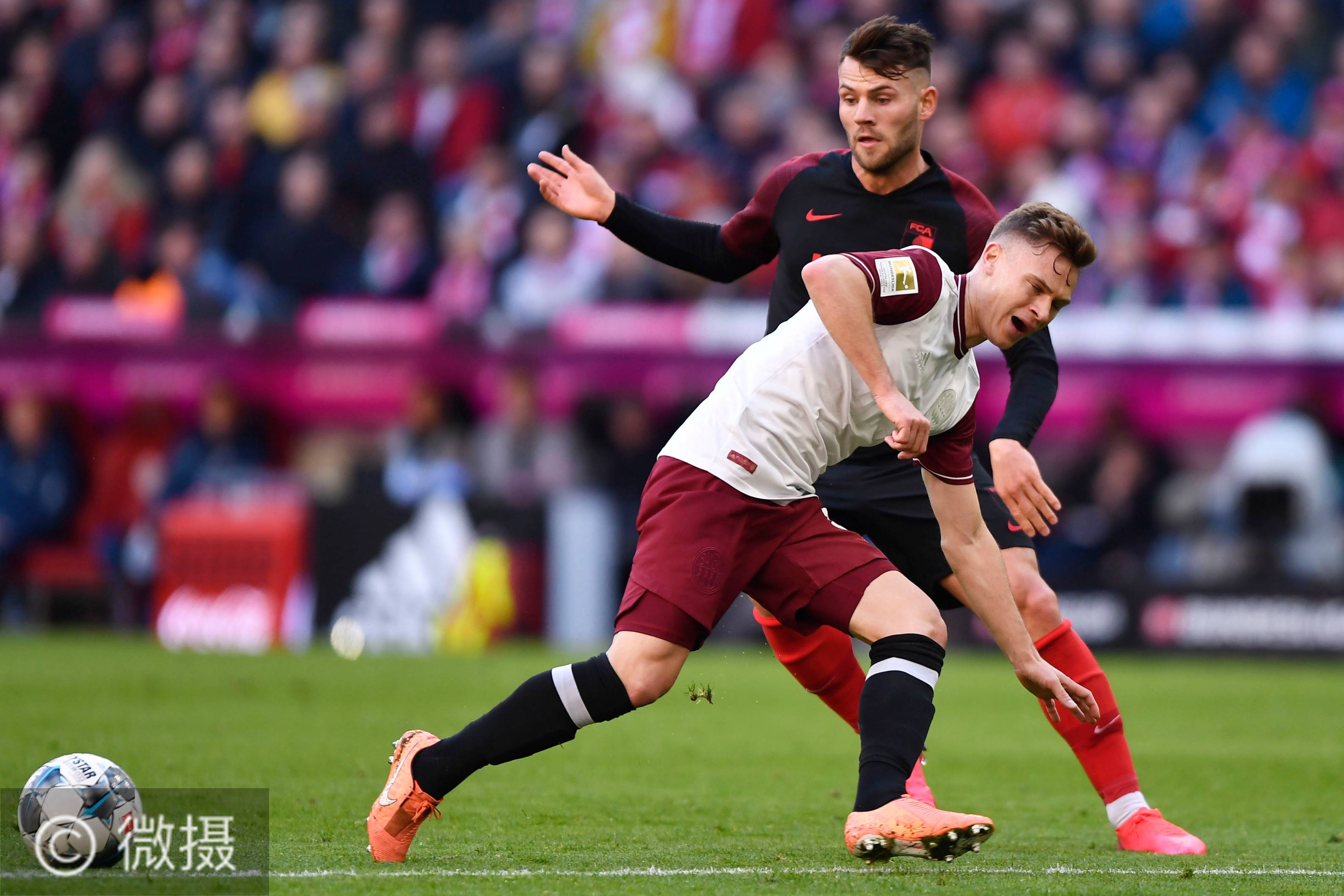2020年3月8日,拜仁慕尼黑队球员基米希(前)与奥格斯堡队球员勒文拼抢。当日,在德国慕尼黑进行的2019-2020赛季德甲联赛第25轮的比赛中,拜仁慕尼黑队主场以2比0战胜奥格斯堡队。新华社/欧新