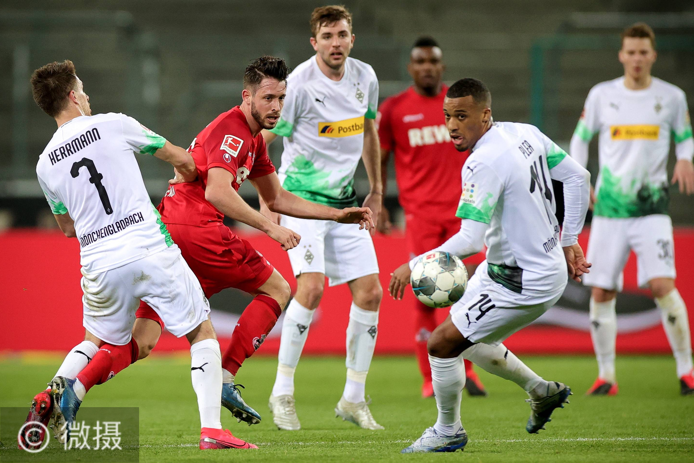 2020年3月11日,门兴格拉德巴赫队球员赫尔曼(左一)与科隆队球员乌特(左二)拼抢。当日,在德国门兴格拉德巴赫进行的2019-2020赛季德甲联赛第21轮的一场补赛中,门兴格拉德巴赫队主场以2比1战胜科隆队。新华社/欧新