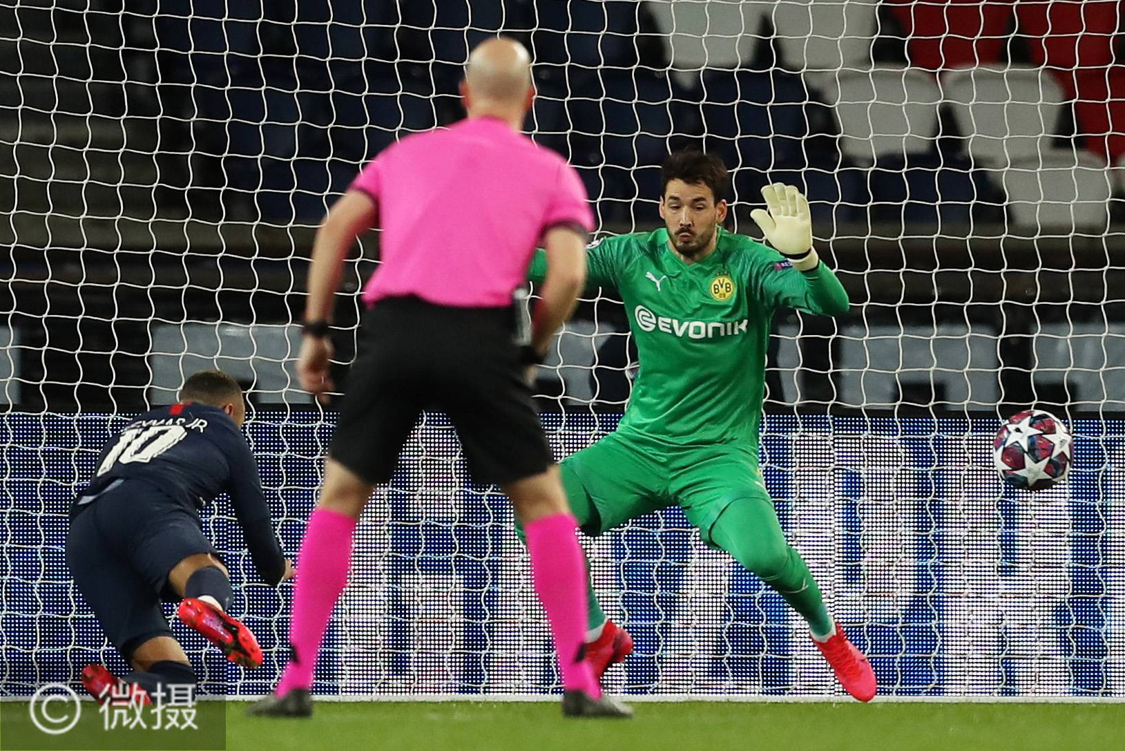 3月11日,巴黎圣日耳曼队球员内马尔(左)攻入球队首球。当日,在法国巴黎进行的2019-2020赛季欧冠联赛八分之一决赛次回合比赛中,法国巴黎圣日耳曼队主场以2比0战胜德国多特蒙德队,以3比2的总比分晋级八强。新华社/欧新