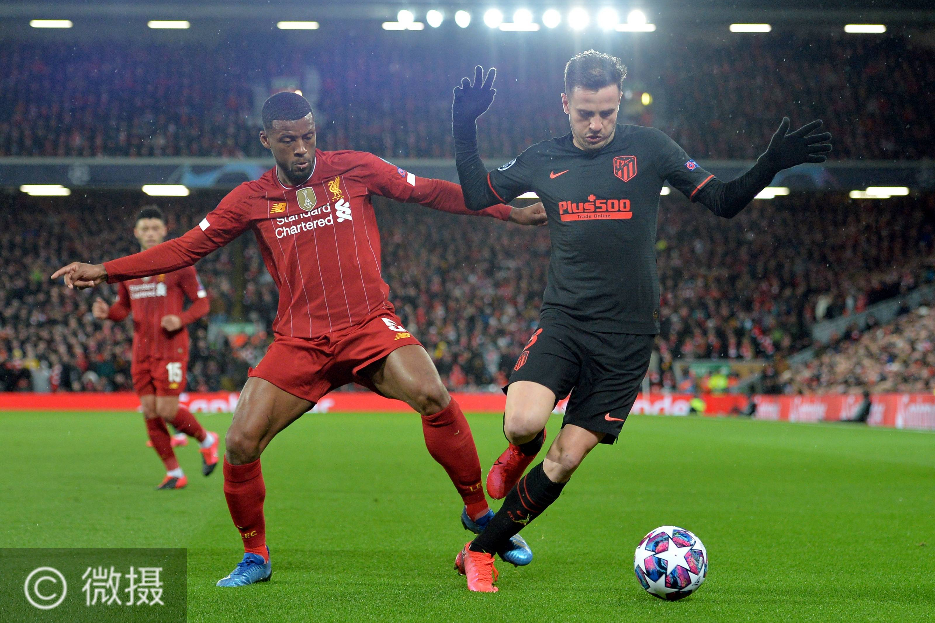2020年3月11日,马德里竞技队球员尼格斯(右)与利物浦队球员维纳尔杜姆拼抢。当日,在英国利物浦进行的2019-2020赛季欧冠联赛八分之一决赛次回合比赛中,马德里竞技队客场经过加时赛以3比2战胜利物浦队,从而以4比2的总比分晋级八强。新华社/欧新