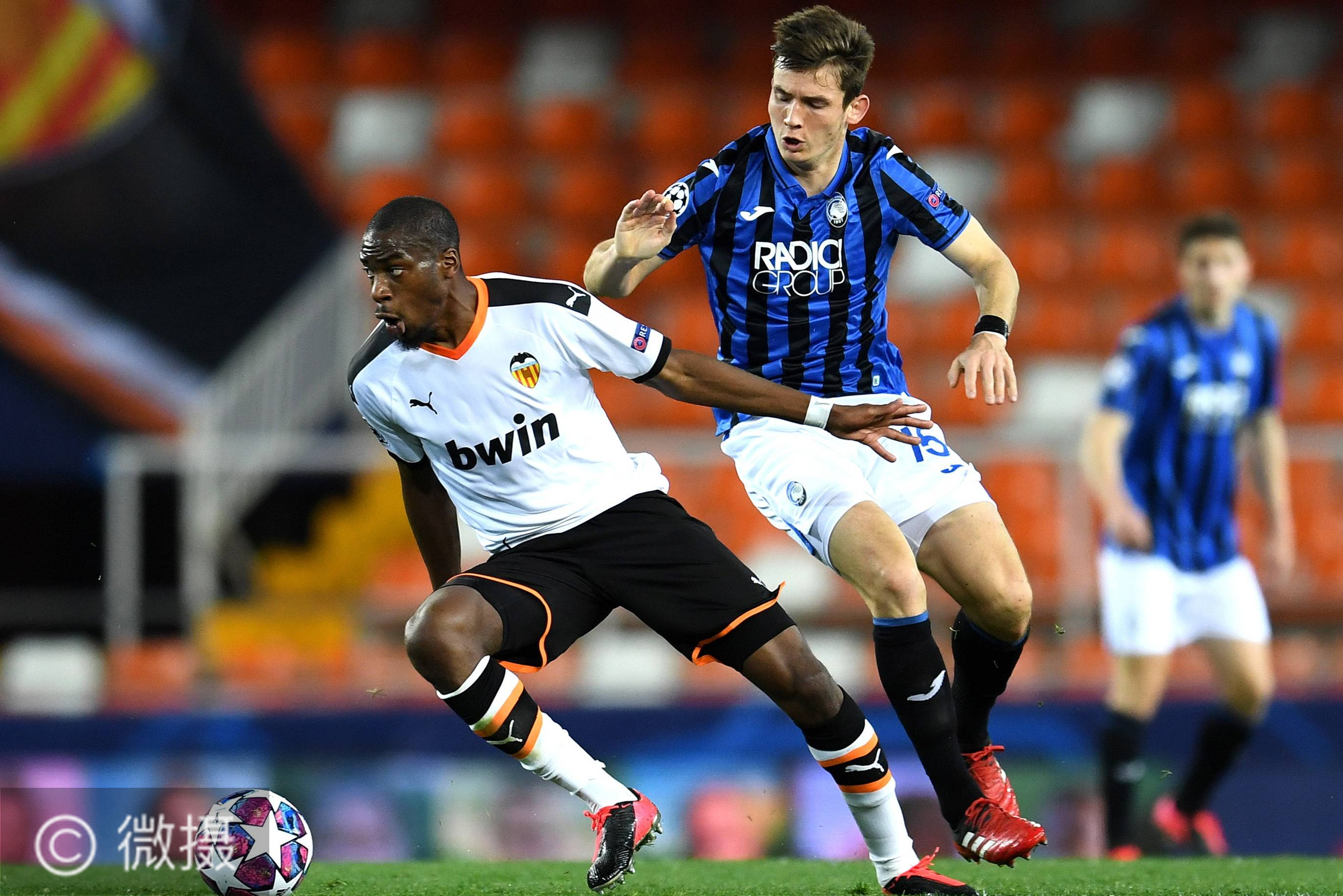 3月10日,亚特兰大队球员德鲁恩(右)与巴伦西亚队球员孔多比亚拼抢。当日,在西班牙巴伦西亚进行的2019-2020赛季欧冠联赛八分之一决赛次回合比赛中,意甲亚特兰大队客场以4比3战胜西甲巴伦西亚队,以8比4的总比分晋级八强。新华社/欧新