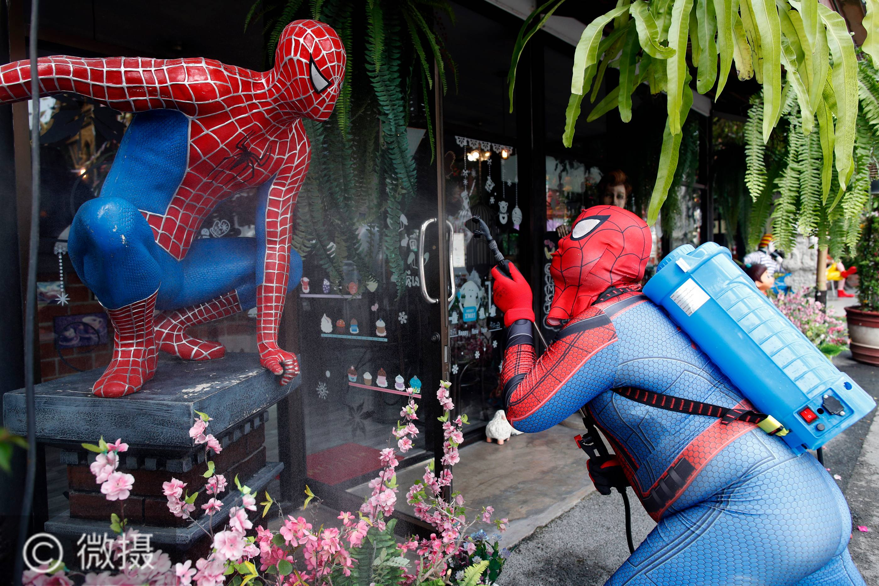4月9日,在泰国沙没沙空府,一名装扮成“蜘蛛侠”的消防员进行消毒作业时经过麦当劳快餐店。 这位名叫西迪蓬·辛通的消防员打扮成“蜘蛛侠”的形象是为了给疫情中的民众加油鼓劲。泰国公共卫生部9日发布的新冠疫情最新数据显示,泰国当日新增确诊病例54例,累计2423例。新华社/欧新