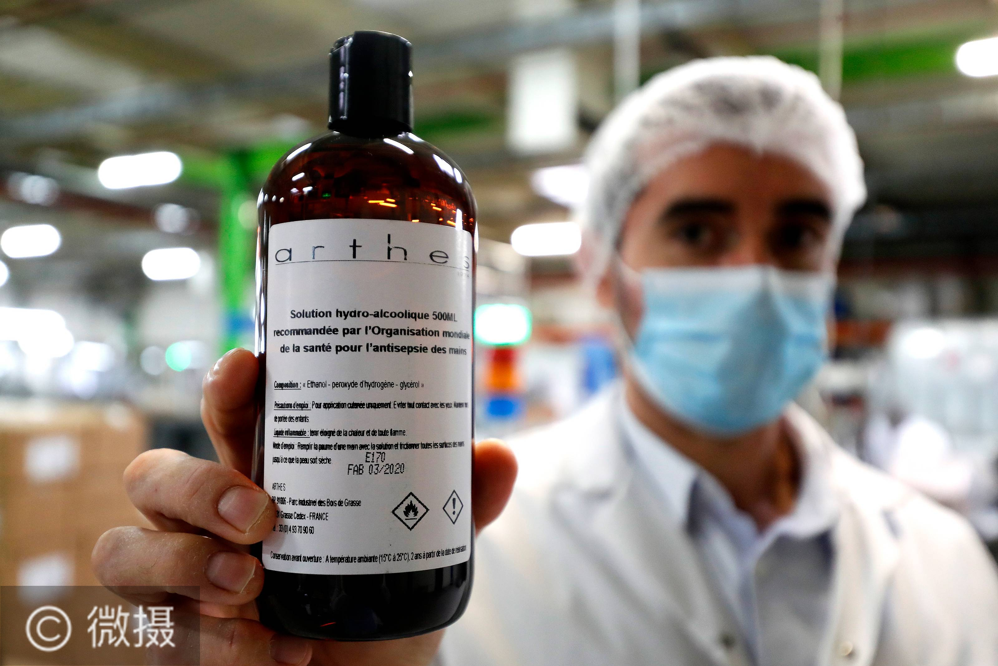 在法国格拉斯的阿尔泰斯集团的工厂,工人展示一瓶酒精消毒免洗洗手液。法国阿尔泰斯集团利用旗下香水生产线制造免洗洗手液,以协助法国政府和民众抗击新冠肺炎疫情。法国卫生总署署长萨洛蒙4月9日说,法国新冠死亡病例升至12210例,重症患者人数首次出现下降。新华社/欧新