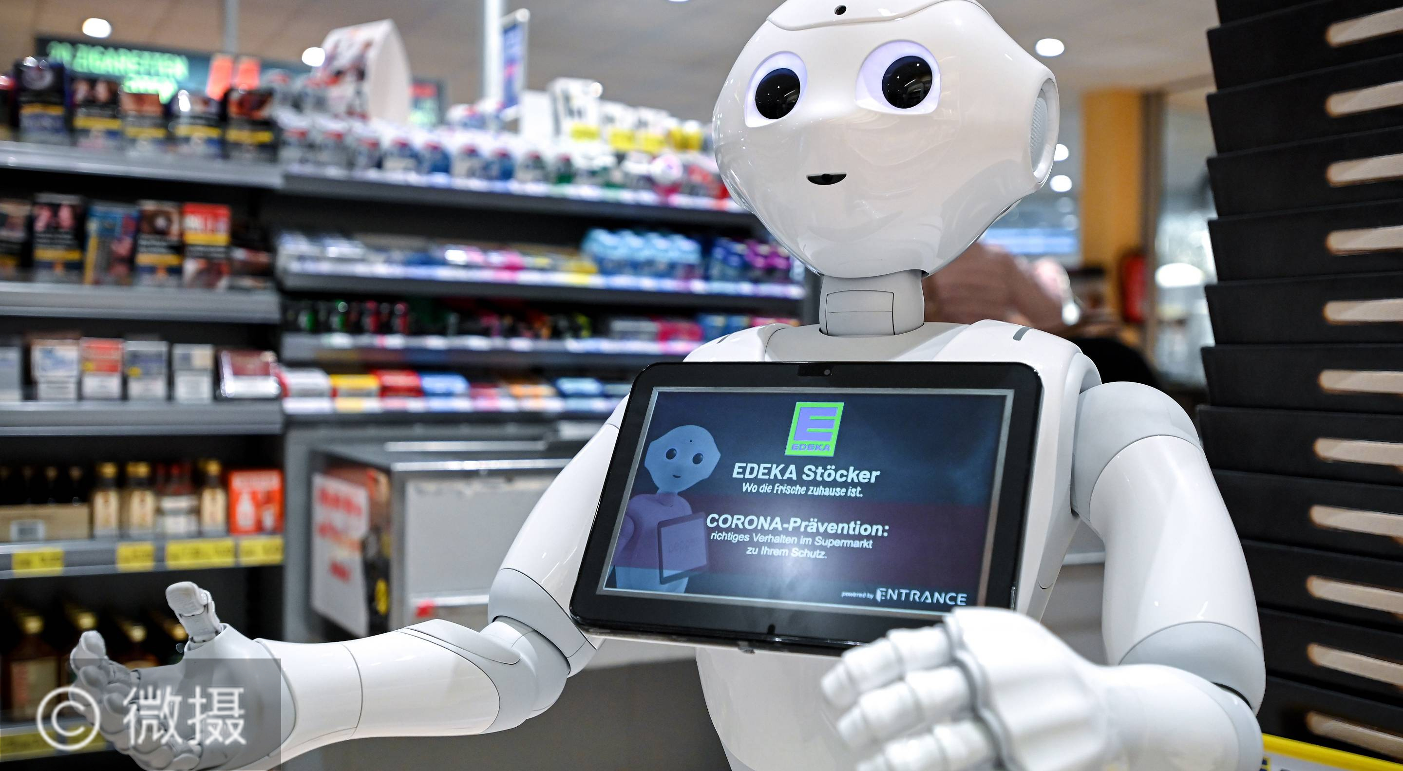 3月31日,在德国林德拉尔的一家超市,机器人Pepper与顾客互动。为降低新冠肺炎疫情传播风险,德国连锁超市“埃德卡”的部分门店开始使用人形机器人Pepper提醒顾客保持社交距离。Pepper是日本软银集团研发的服务机器人。新华社/欧新