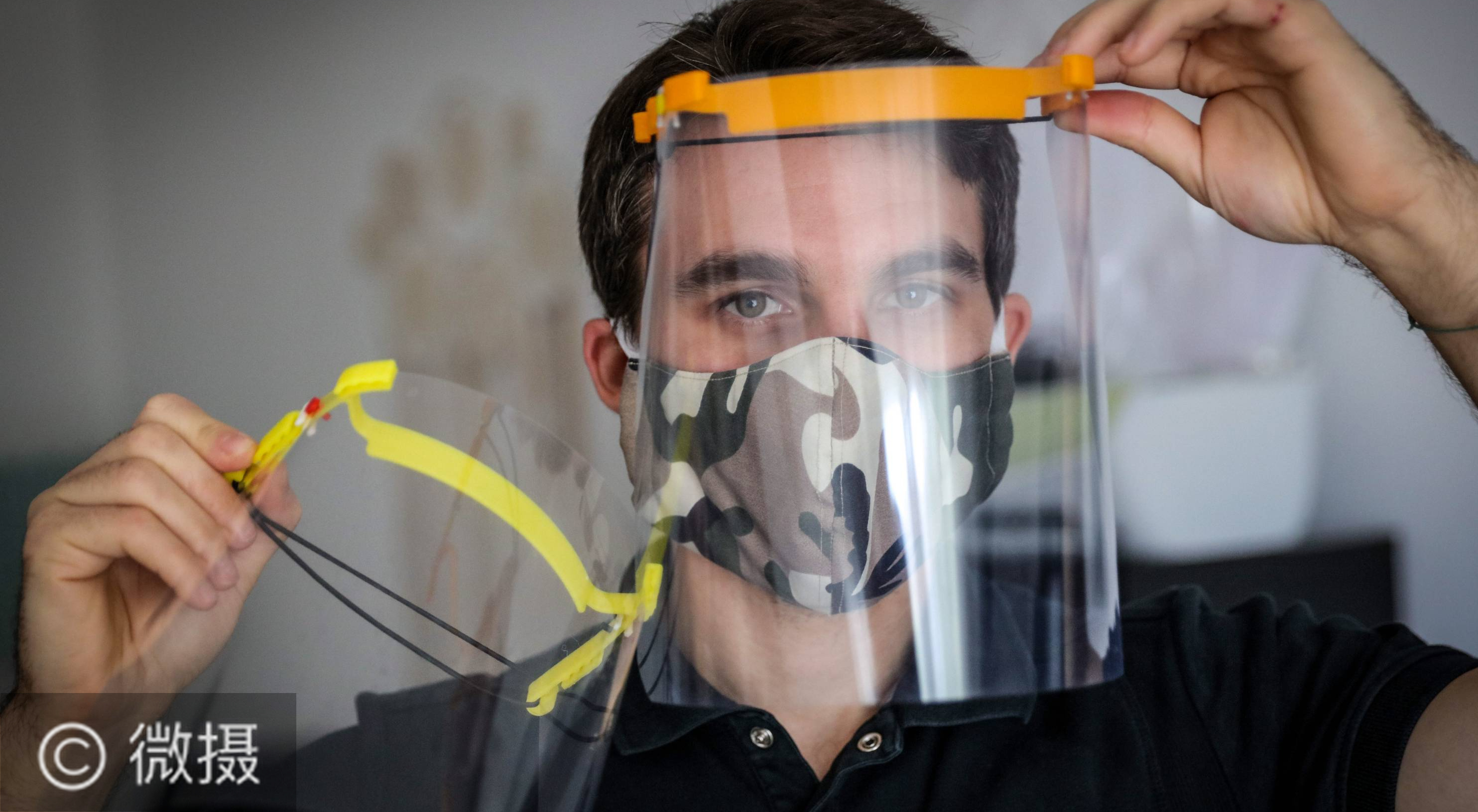 4月6日,在法国卡尔维,米歇尔·塞拉展示3D打印的面罩。米歇尔·塞拉和亚历山德拉·特拉尼是居住在法国卡尔维的一对夫妇。为了应对新冠肺炎疫情,他们的两台3D打印设备日夜运行,目前已经生产了超过480个防护面罩。这些防护面罩将提供给医护人员、药剂师和消防员。新华社/欧新