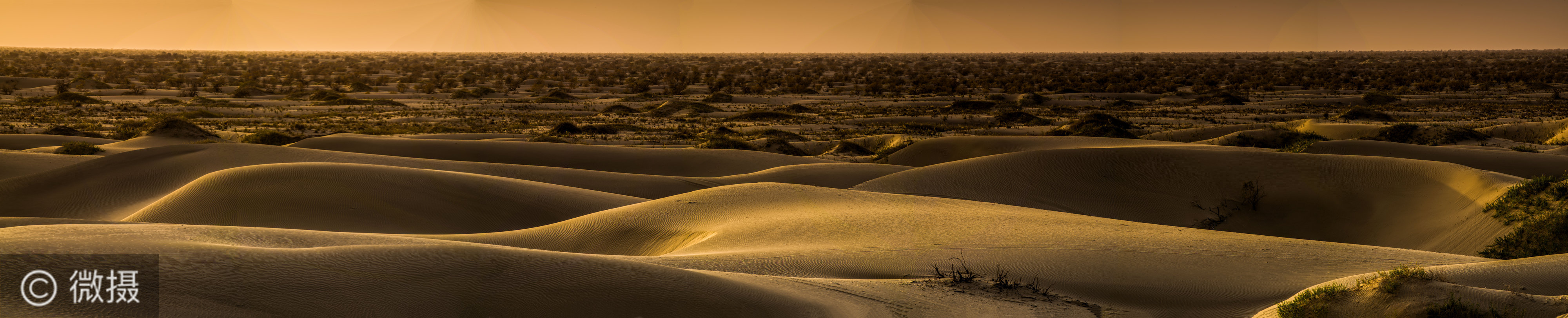 画卷-67(中国、塔克拉玛干沙漠、2018) 这是麦盖提绿洲与塔克拉玛干沙漠接壤地带的全景图画面,远处是十几公里不等的胡杨林。塔克拉玛干沙漠,位于新疆南疆的塔里木盆地中心,是中国最大的沙漠,也是世界第十大沙漠,同时亦是世界第二大流动沙漠。整个沙漠东西长约1000公里,南北宽约40