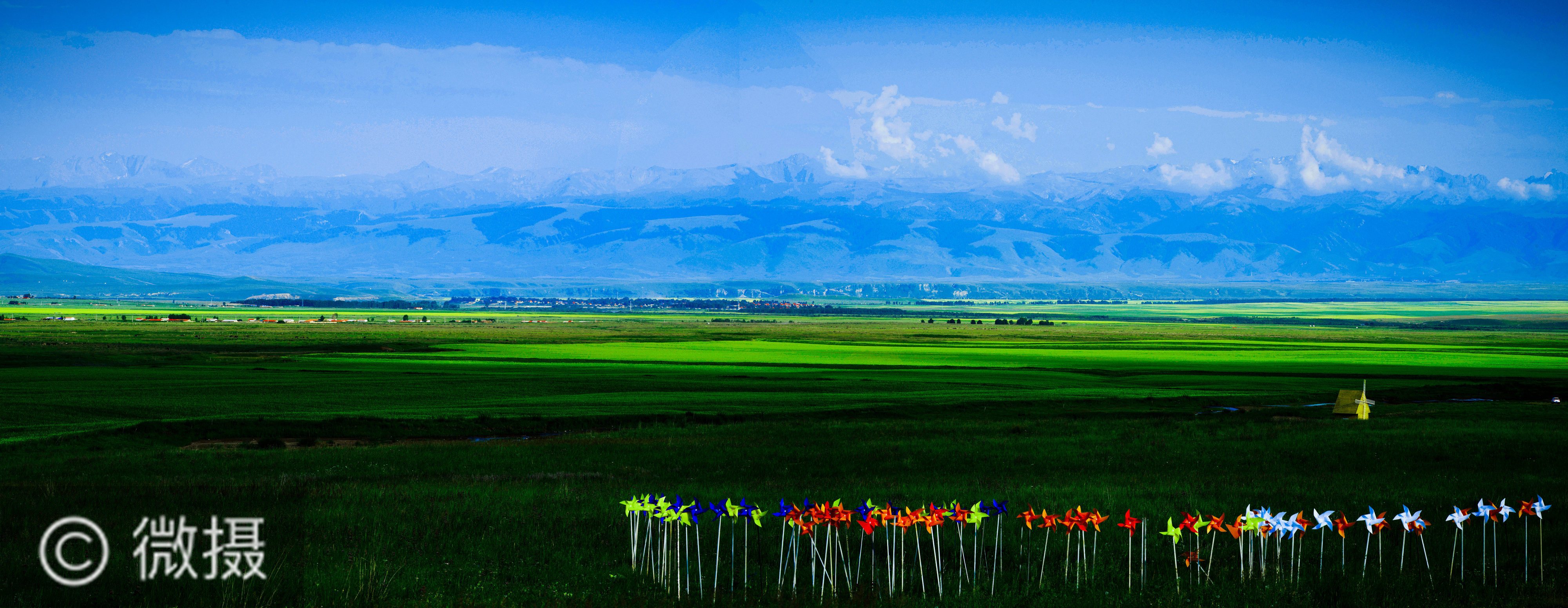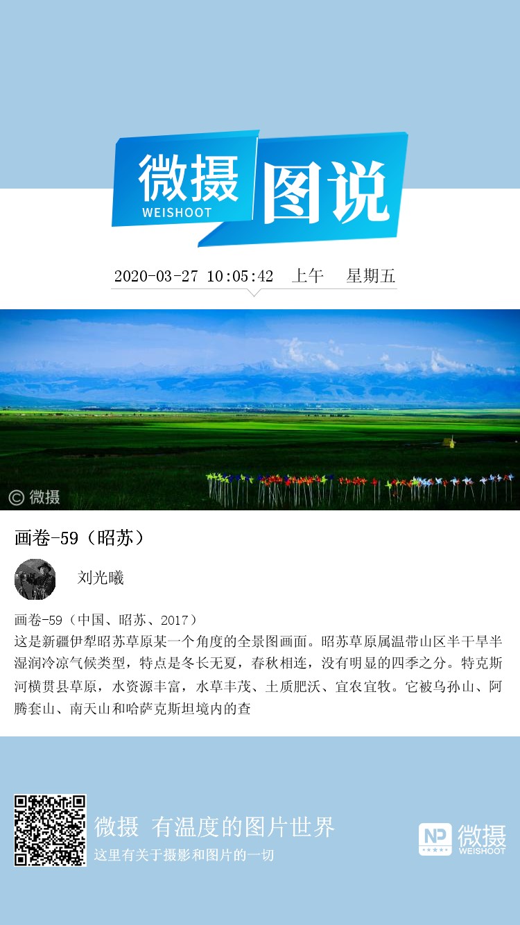 画卷-59(中国、昭苏、2017) 这是新疆伊犁昭苏草原某一个角度的全景图画面。昭苏草原属温带山区半干旱半湿润冷凉气候类型,特点是冬长无夏,春秋相连,没有明显的四季之分。特克斯河横贯县草原,水资源丰富,水草丰茂、土质肥沃、宜农宜牧。它被乌孙山、阿腾套山、南天山和哈萨克斯坦境内的查