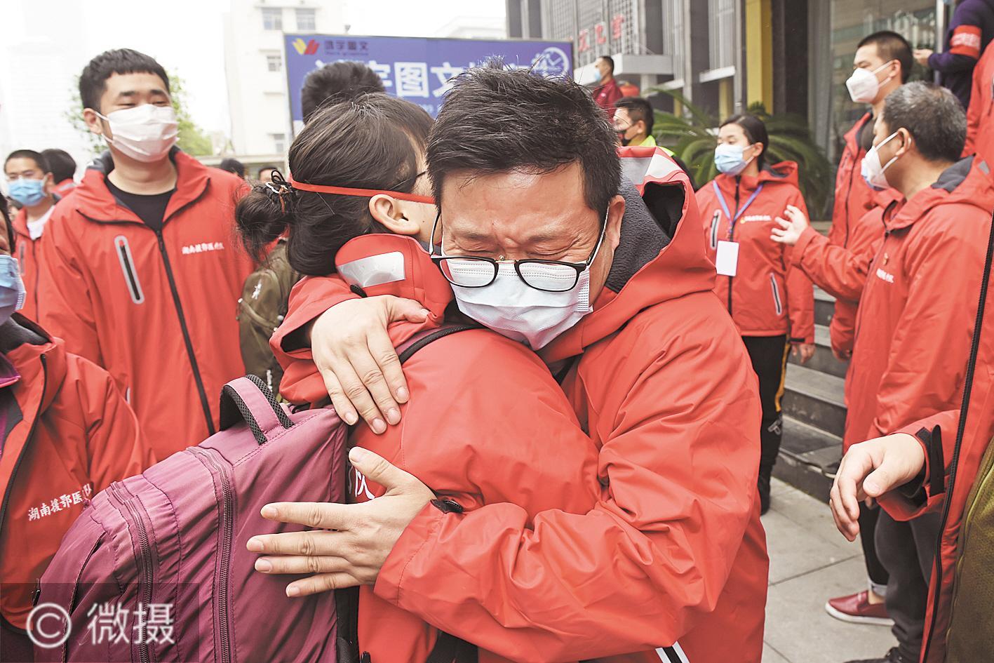 3月22日,湖南援鄂医疗队心理医疗组43人启程离汉,在驻地汉庭洪山广场店举办的简短送别仪式上,队员们热泪盈眶。(湖北日报全媒记者 李溪 摄)