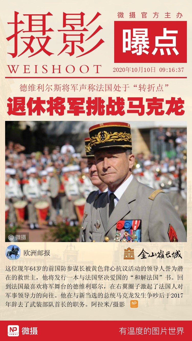 这位现年64岁的前国防参谋长被黄色背心抗议活动的领导人誉为潜在的救世主,他将发行一本与法国坚决爱国的“和解法国”书。回到法国最喜欢将军舞台的德维利耶尔,在右翼圈子激起了法国人对军事领导力的向往。他在与新当选的总统马克龙发生争吵后于2017年辞去了武装部队首长的职务。阿拉米/摄影