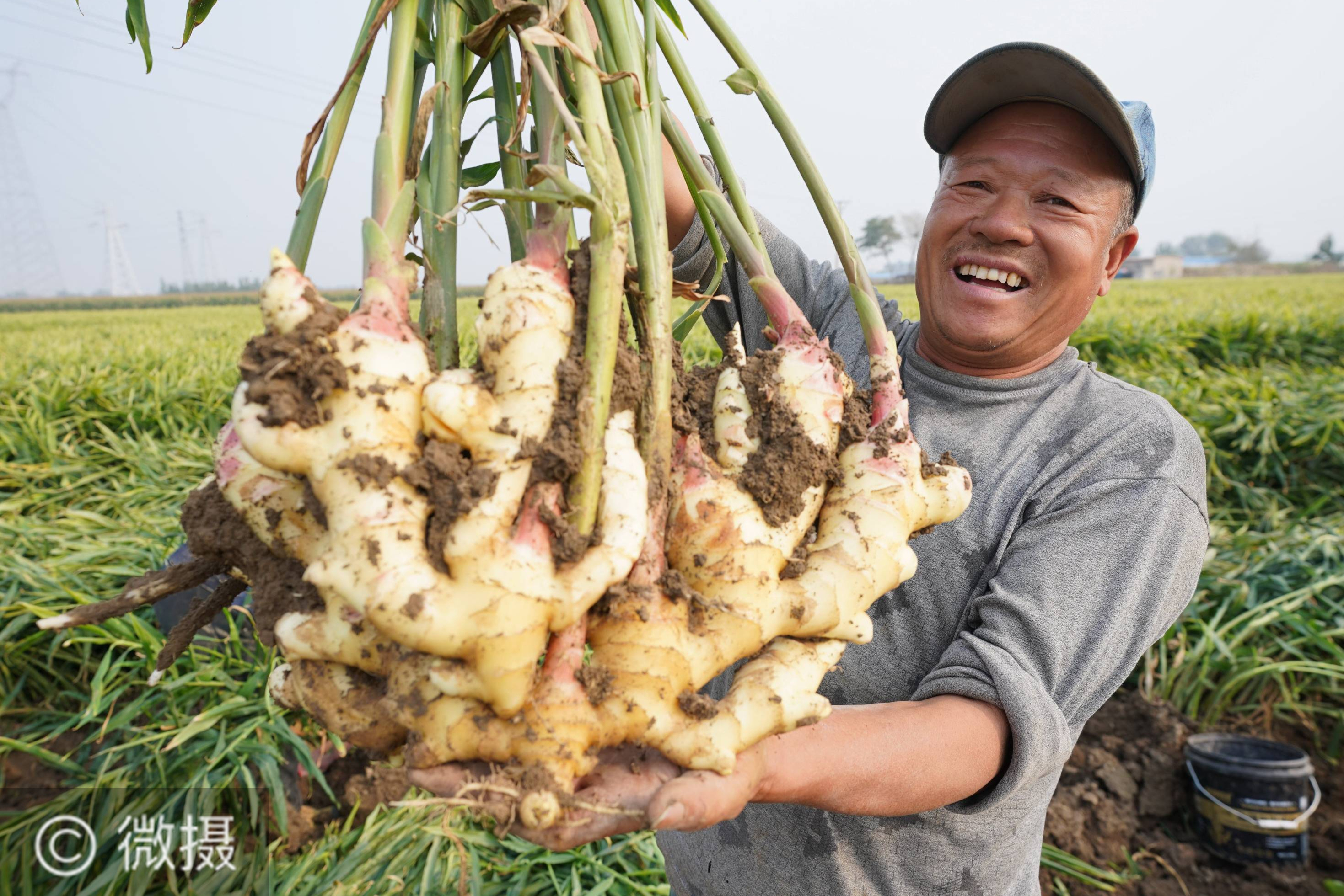 10月10日,河北省唐山市路北区韩城镇大张刘村农民展示收获的生姜。近年来,河北省唐山市路北区韩城镇在实施产业富民过程中,通过土地流转模式引导农民规模化发展生姜种植,取得良好的经济效益。据介绍,目前韩城镇生姜种植面积1万余亩,有效促进了农民增收。新华社记者 朱旭东 摄