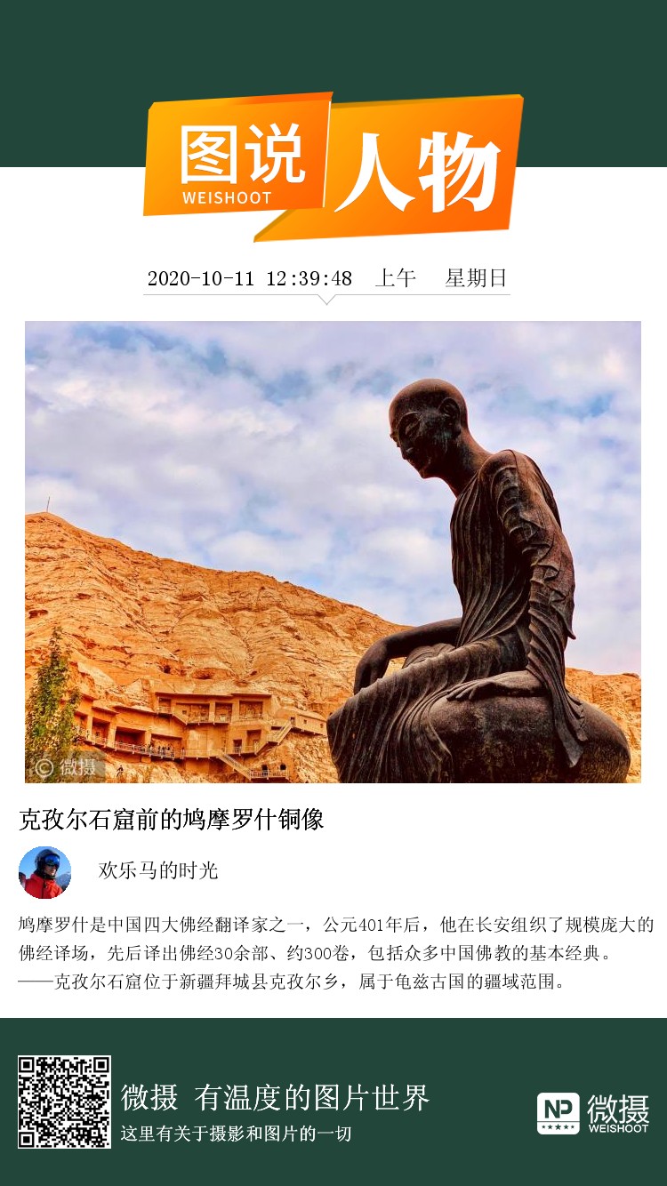 鸠摩罗什是中国四大佛经翻译家之一,公元401年后,他在长安组织了规模庞大的佛经译场,先后译出佛经30余部、约300卷,包括众多中国佛教的基本经典。 ——克孜尔石窟位于新疆拜城县克孜尔乡,属于龟兹古国的疆域范围。