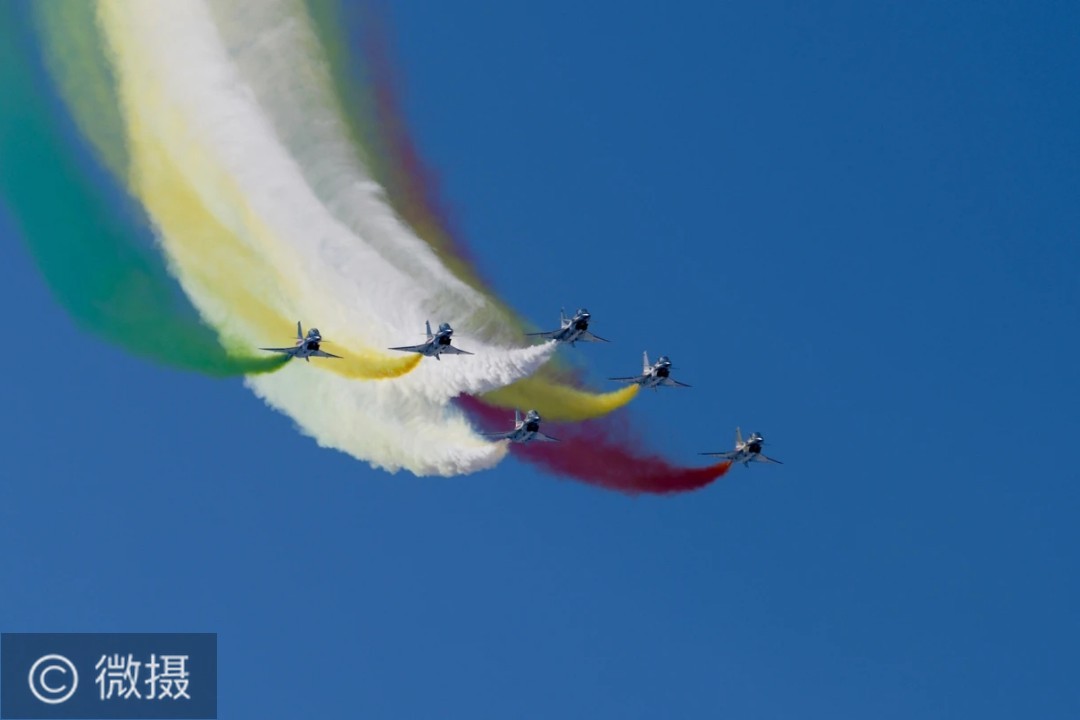 中国空军有三支飞行表演队。“八一”飞行表演队,采用歼十作为表演用机;红鹰飞行表演队,采用K-8教练机作为表演用机;天之翼飞行表演队,初教-6作为表演用机。图为八一飞行表演队五机编队。