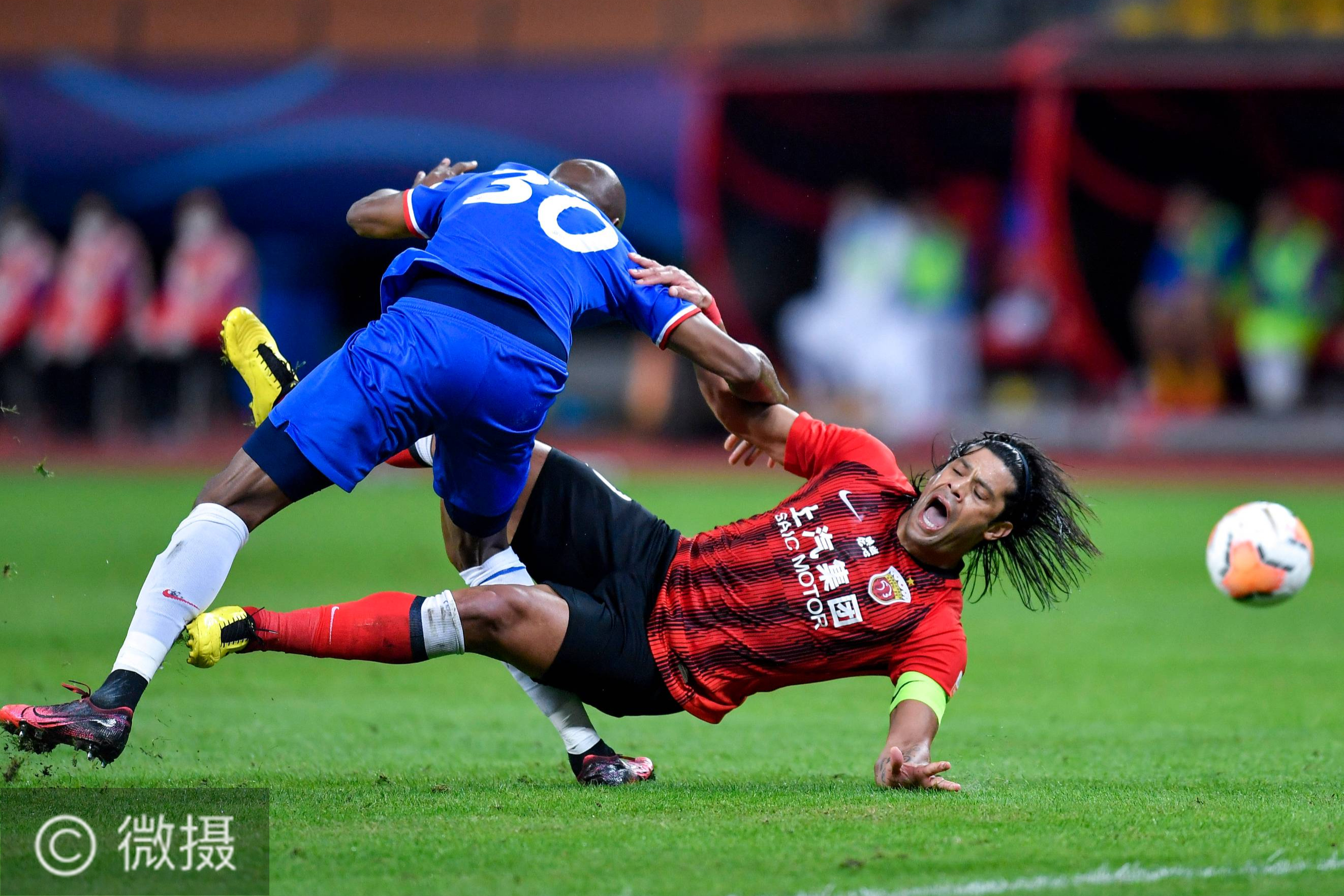 10月23日,上海上港队球员胡尔克(右)与上海绿地申花队球员姆比亚在比赛中拼抢。当日,在2020赛季中国足球协会超级联赛(苏州赛区)第16轮比赛中,上海上港队与上海绿地申花队在常规时间和加时赛中以1比1战平,最终上海上港对通过点球大战战胜上海绿地申花队,晋级四强。新华社记者许畅摄