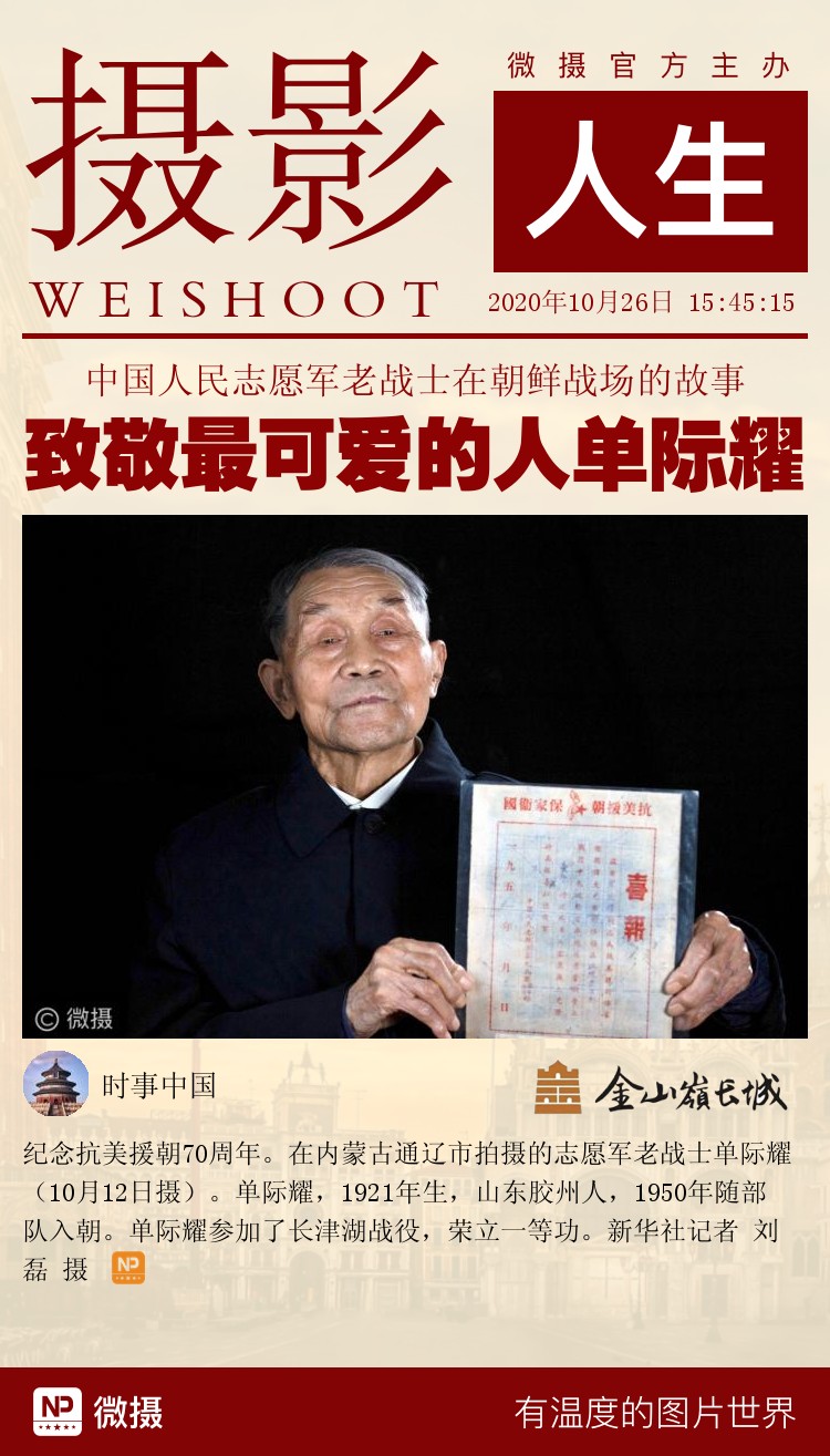 纪念抗美援朝70周年。在内蒙古通辽市拍摄的志愿军老战士单际耀(10月12日摄)。单际耀,1921年生,山东胶州人,1950年随部队入朝。单际耀参加了长津湖战役,荣立一等功。新华社记者 刘磊 摄