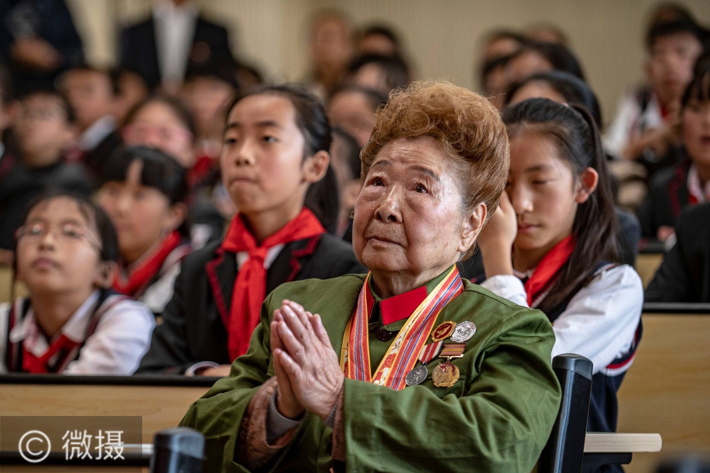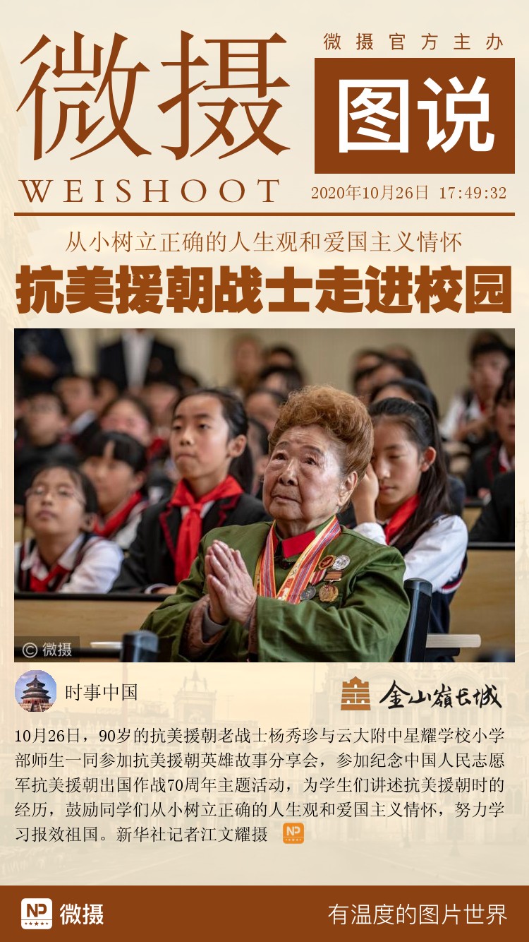 10月26日,90岁的抗美援朝老战士杨秀珍与云大附中星耀学校小学部师生一同参加抗美援朝英雄故事分享会,参加纪念中国人民志愿军抗美援朝出国作战70周年主题活动,为学生们讲述抗美援朝时的经历,鼓励同学们从小树立正确的人生观和爱国主义情怀,努力学习报效祖国。新华社记者江文耀摄