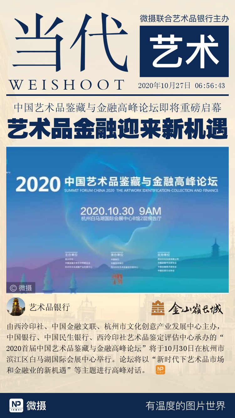 由西泠印社、中国金融文联、杭州市文化创意产业发展中心主办,中国银行、中国民生银行、西泠印社艺术品鉴定评估中心承办的“2020首届中国艺术品鉴藏与金融高峰论坛”将于10月30日在杭州市滨江区白马湖国际会展中心举行。论坛将以“新时代下艺术品市场和金融业的新机遇”等主题进行高峰对话。