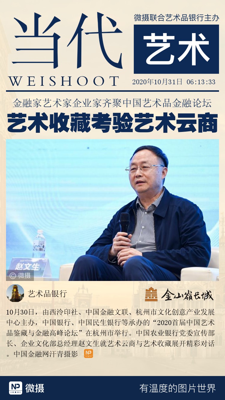 10月30日,由西泠印社、中国金融文联、杭州市文化创意产业发展中心主办,中国银行、中国民生银行等承办的“2020首届中国艺术品鉴藏与金融高峰论坛”在杭州市举行。中国农业银行党委宣传部长、企业文化部总经理赵文生就艺术云商与艺术收藏展开精彩对话。中国金融网汗青摄影