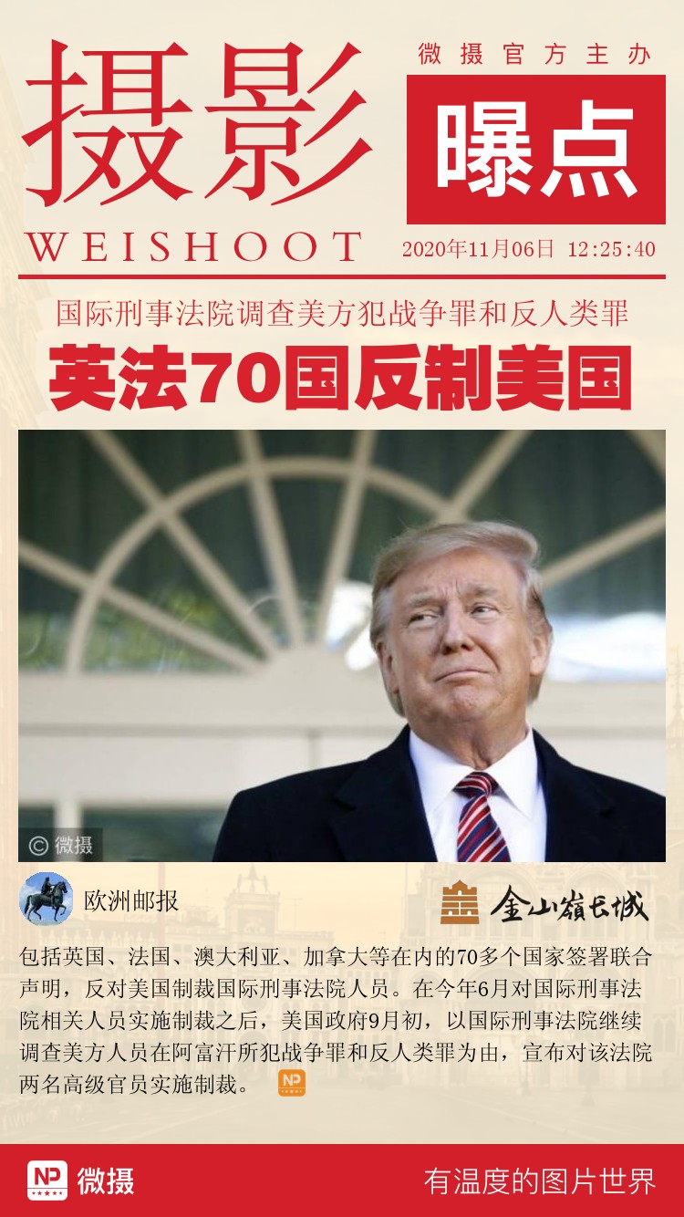 包括英国、法国、澳大利亚、加拿大等在内的70多个国家签署联合声明,反对美国制裁国际刑事法院人员。在今年6月对国际刑事法院相关人员实施制裁之后,美国政府9月初,以国际刑事法院继续调查美方人员在阿富汗所犯战争罪和反人类罪为由,宣布对该法院两名高级官员实施制裁。