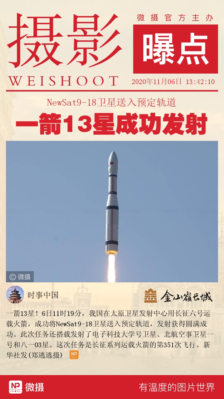 一箭13星!6日11时19分,我国在太原卫星发射中心用长征六号运载火箭,成功将NewSat9-18卫星送入预定轨道,发射获得圆满成功。此次任务还搭载发射了电子科技大学号卫星、北航空事卫星一号和八一03星。这次任务是长征系列运载火箭的第351次飞行。新华社发(郑逃逃摄)