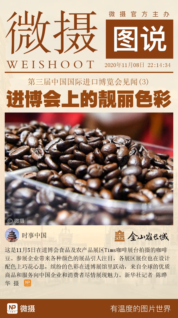 这是11月5日在进博会食品及农产品展区Tims咖啡展台拍摄的咖啡豆。参展企业带来各种颜色的展品引人注目,各展区展位也在设计配色上巧花心思,缤纷的色彩在进博展馆里跃动,来自全球的优质商品和服务向中国企业和消费者尽情展现魅力。新华社记者 陈晔华 摄