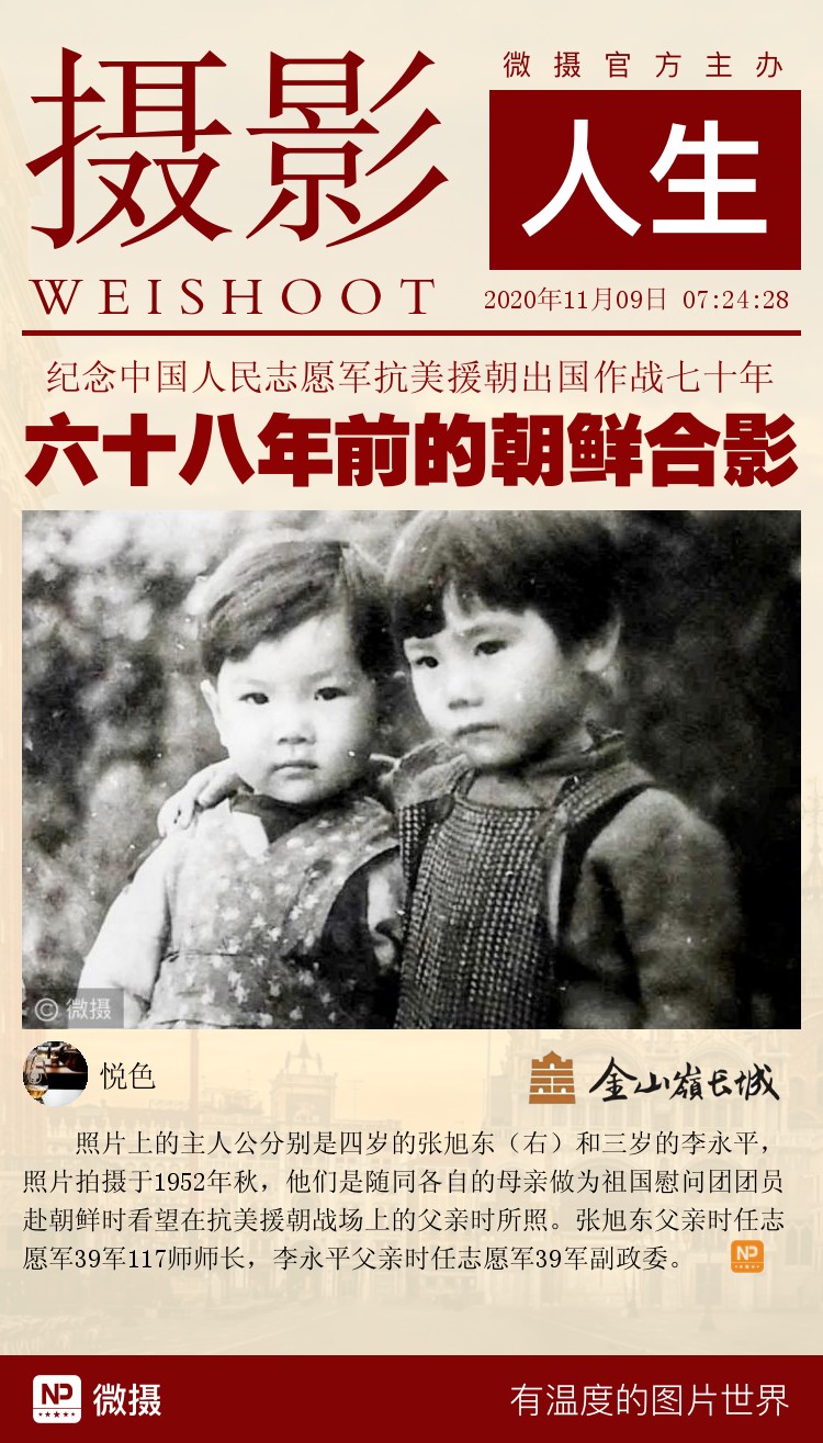 照片上的主人公分别是四岁的张旭东(右)和三岁的李永平,照片拍摄于1952年秋,他们是随同各自的母亲做为祖国慰问团团员赴朝鲜时看望在抗美援朝战场上的父亲时所照。张旭东父亲时任志愿军39军117师师长,李永平父亲时任志愿军39军副政委。