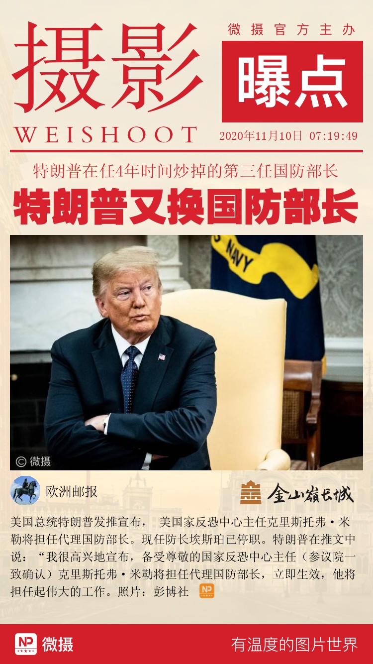 美国总统特朗普发推宣布, 美国家反恐中心主任克里斯托弗·米勒将担任代理国防部长。现任防长埃斯珀已停职。特朗普在推文中说:“我很高兴地宣布,备受尊敬的国家反恐中心主任(参议院一致确认)克里斯托弗·米勒将担任代理国防部长,立即生效,他将担任起伟大的工作。照片:彭博社